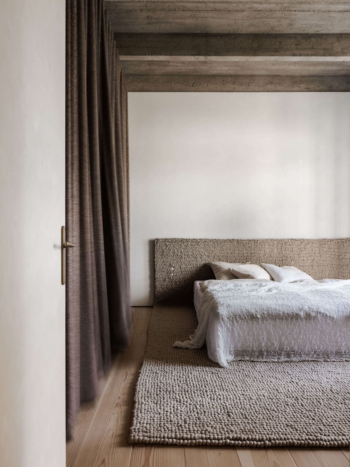 Dominantou hlavnej spálne sa bezpochyby stala manželská posteľ. Jej čelo plynule prechádza až na podlahu, vďaka čomu zároveň plní funkciu koberca. Celkovú atmosféru tejto miestnosti navyše podčiarkujú závesy, ktoré za sebou ukrývajú všetok potrebný úložný priestor, a odhalený železobetónový rebrový strop.