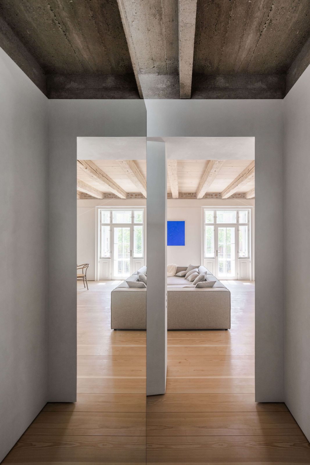 „Pôvodne priečne delený priestor sa otvára vo všetkých smeroch, čím vznikajú dlhé priehľady. Dopomáha im aj tvarovanie stavebných otvorov v strednej nosnej stene, ktoré sú zároveň protipólom k pôvodným oknám na fasáde. Všetko ostatné je len nábytok, ktorý je nositeľom svojej funkčnej roviny,“ približuje projekt jeho autor.