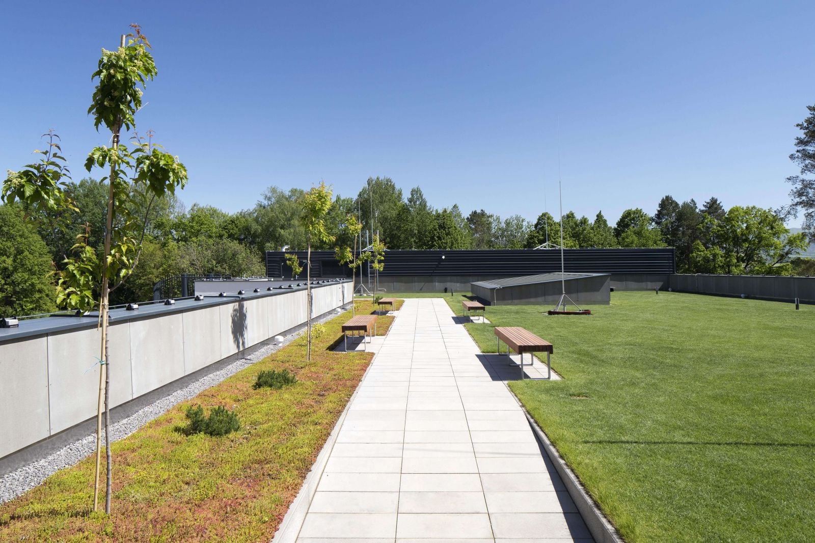 Zelená pobytová strecha slúži ako oddychová zóna, kde sa pacienti môžu prejsť či posedieť si na lavičkách. Na streche boli tiež vysadené stromčeky a kry, ktoré po čase poskytnú návštevníkom príjemné tienenie. Okrem praktického využitia a vizuálneho aspektu zvolené riešenie zároveň eliminuje aj množstvo tvrdých plôch v areáli nemocnice, čo pozitívne ovplyvňuje klímu počas horúcich letných mesiacov.