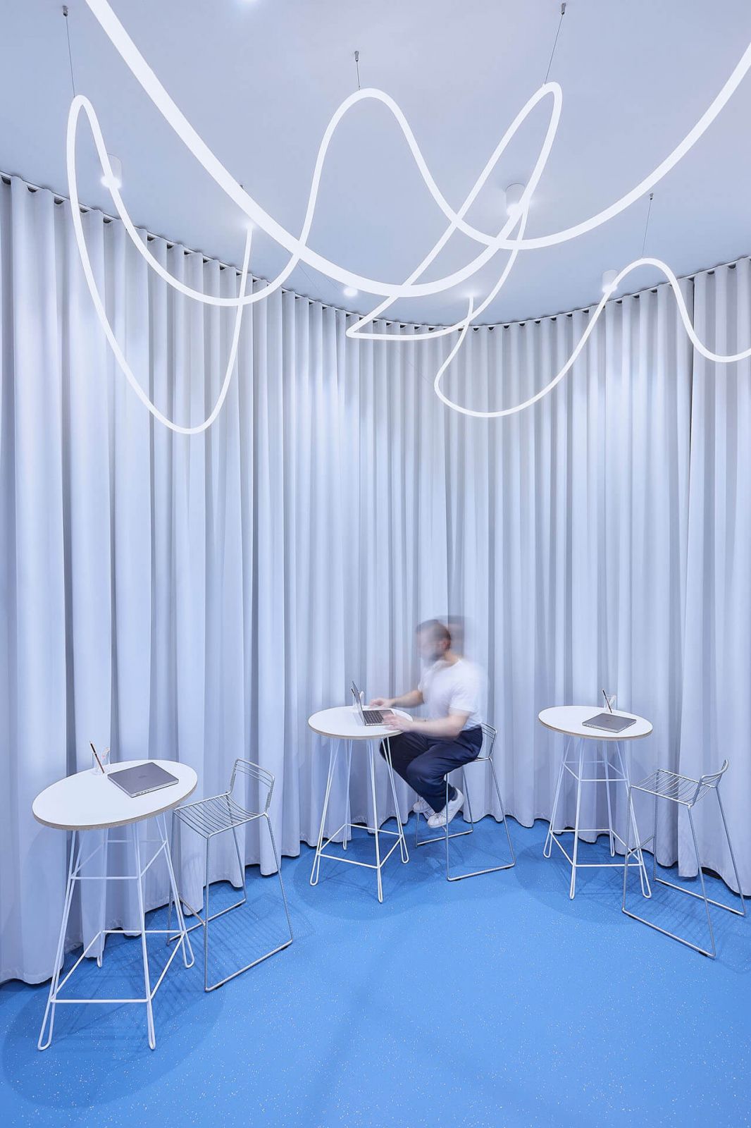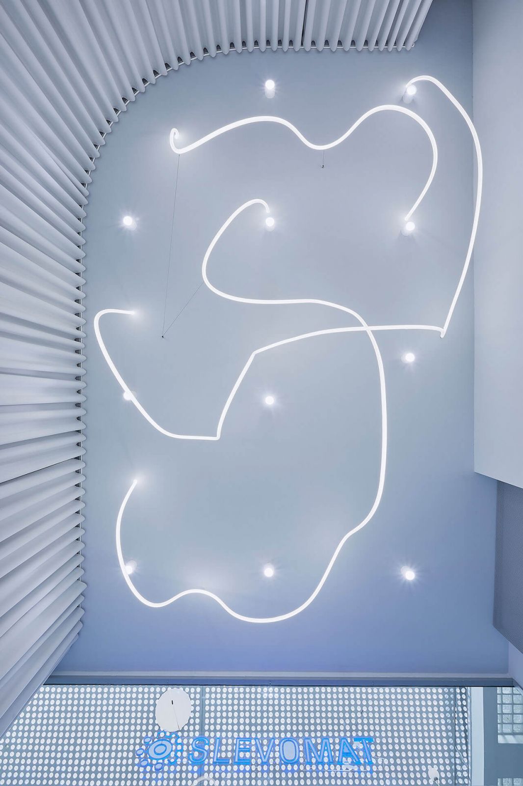 Ďalším výrazným prvkom je centrálne umiestnené atypické závesné svietidlo, ktoré prechádza ponad celý interiér. Jeho podobu, rovnako ako logo predajne, navrhla spoločnosť Love LED neon. Aj napriek tomu, že líniové svietidlo pôsobí na prvý pohľad nepremyslene, jeho osadenie od závesov a stien je podľa slov architektov navrhnuté veľmi presne.