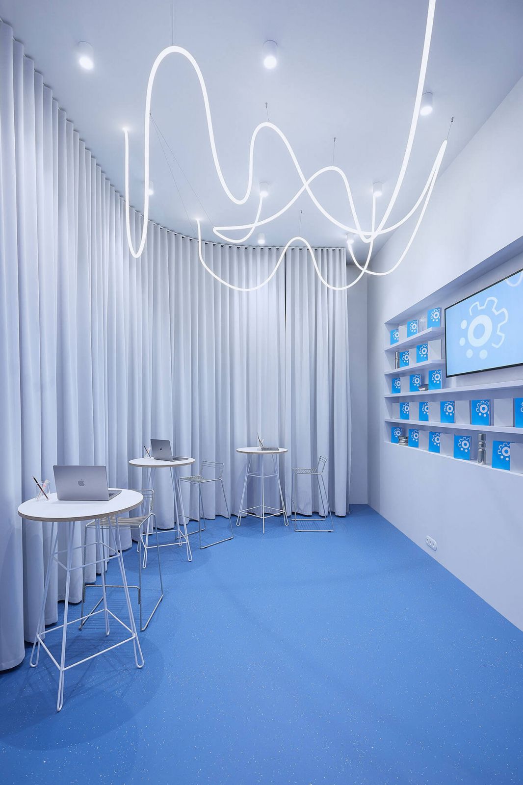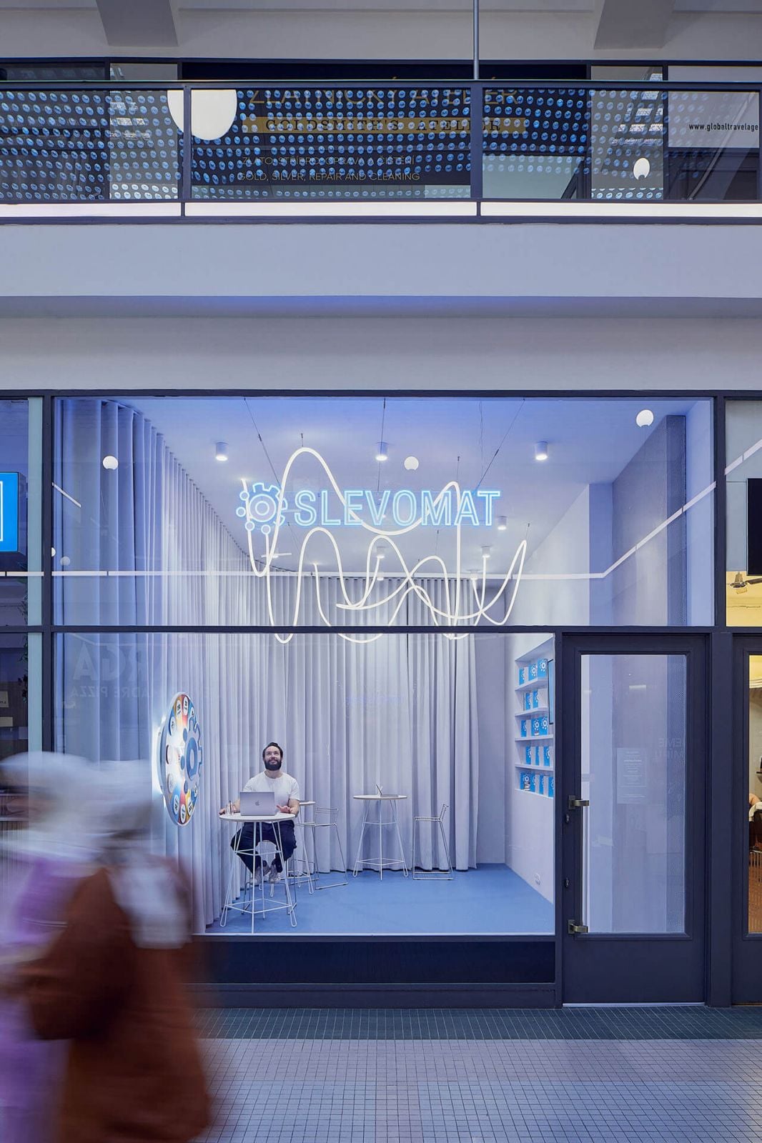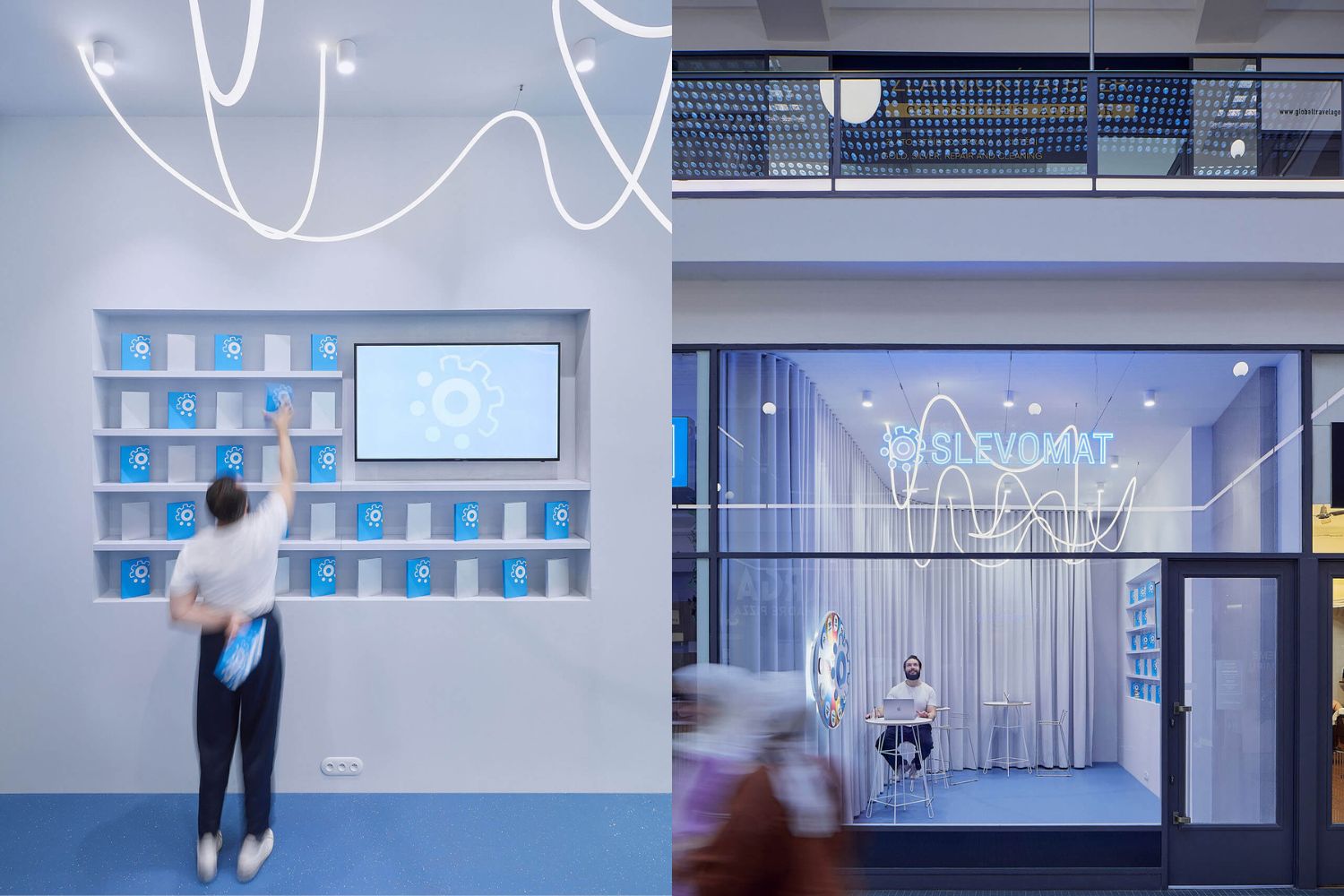 V prípade interiéru zážitkovej predajne Slevomat architekti stavili na niekoľko dominantných prvkov. Prvým z nich sa stala modrá farba, ktorá sa v interiéri objavuje vo forme linoleovej podlahy a LED nápisu nad hlavným vchodom. Svetlomodrým dojmom pôsobia, vďaka LED osvetleniu, tiež šedé závesy. Tie samotnú predajňu opticky oddeľujú od zázemia pre zamestnancov a skladu.