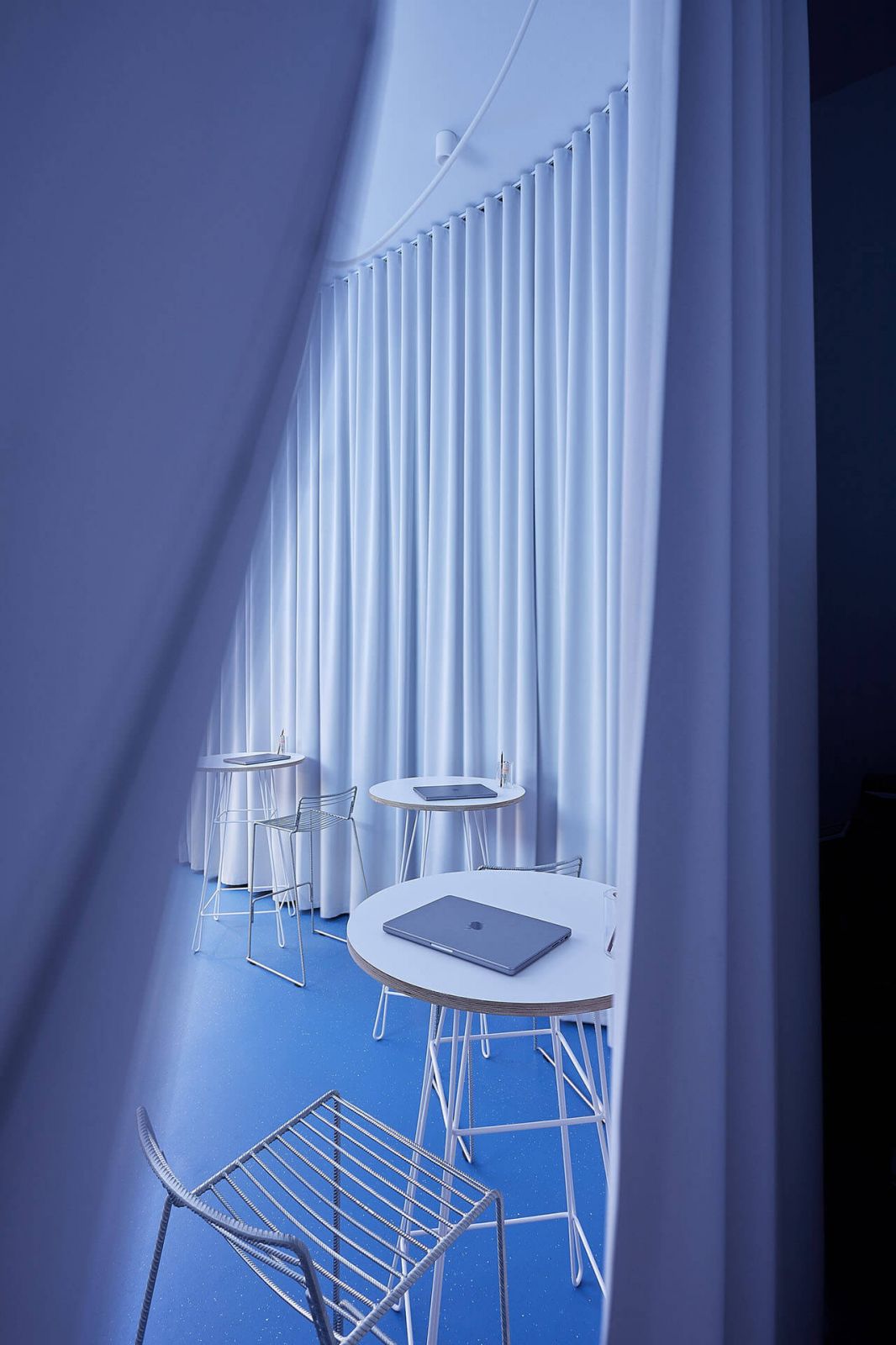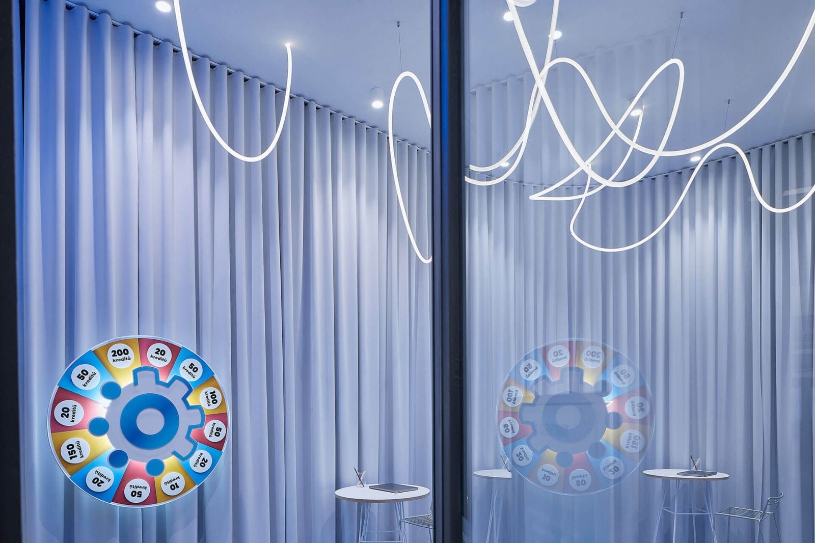 Zvyšné interiérové prvky ako stoličky či stoly tu boli zredukované na minimum. Vďaka tomu v priestore vyniklo Koleso šťastia, na ktorom si návštevníci môžu vytočiť rôzne výhry v podobe kreditov na zážitky. „Výsledný jednoduchý scénický priestor je začiatkom cesty k zážitkom, ktoré svojim zákazníkom Slevomat ponúka,“ ukončujú opis projektu jeho autori.