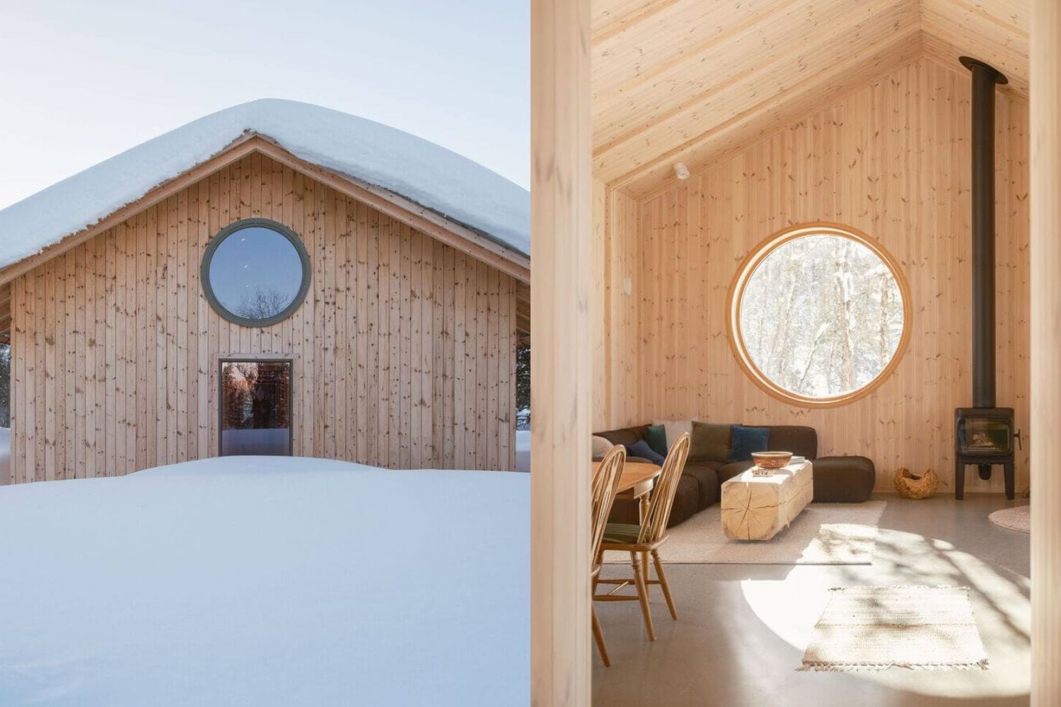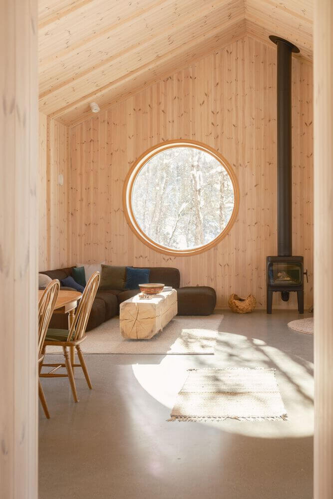 Jedálenskej zóne dominuje stôl s retro nádychom a šestica stoličiek. Doplnkové sedenie architekt v tejto časti vyriešil integrovaným kútom na čítanie. V rovnako minimalistickom duchu bola navrhnutá aj obývacia izba. Okrem sedacej súpravy tu nájdeme tiež konferenčný stolík z masívneho dreva, pohodlné kreslo a malú piecku. Celkovú kompozíciu dotvára kruhové okno, cez ktoré do miestnosti vstupuje viac svetla. Výrazným priestorovým prvkom je tiež otvorená galéria.