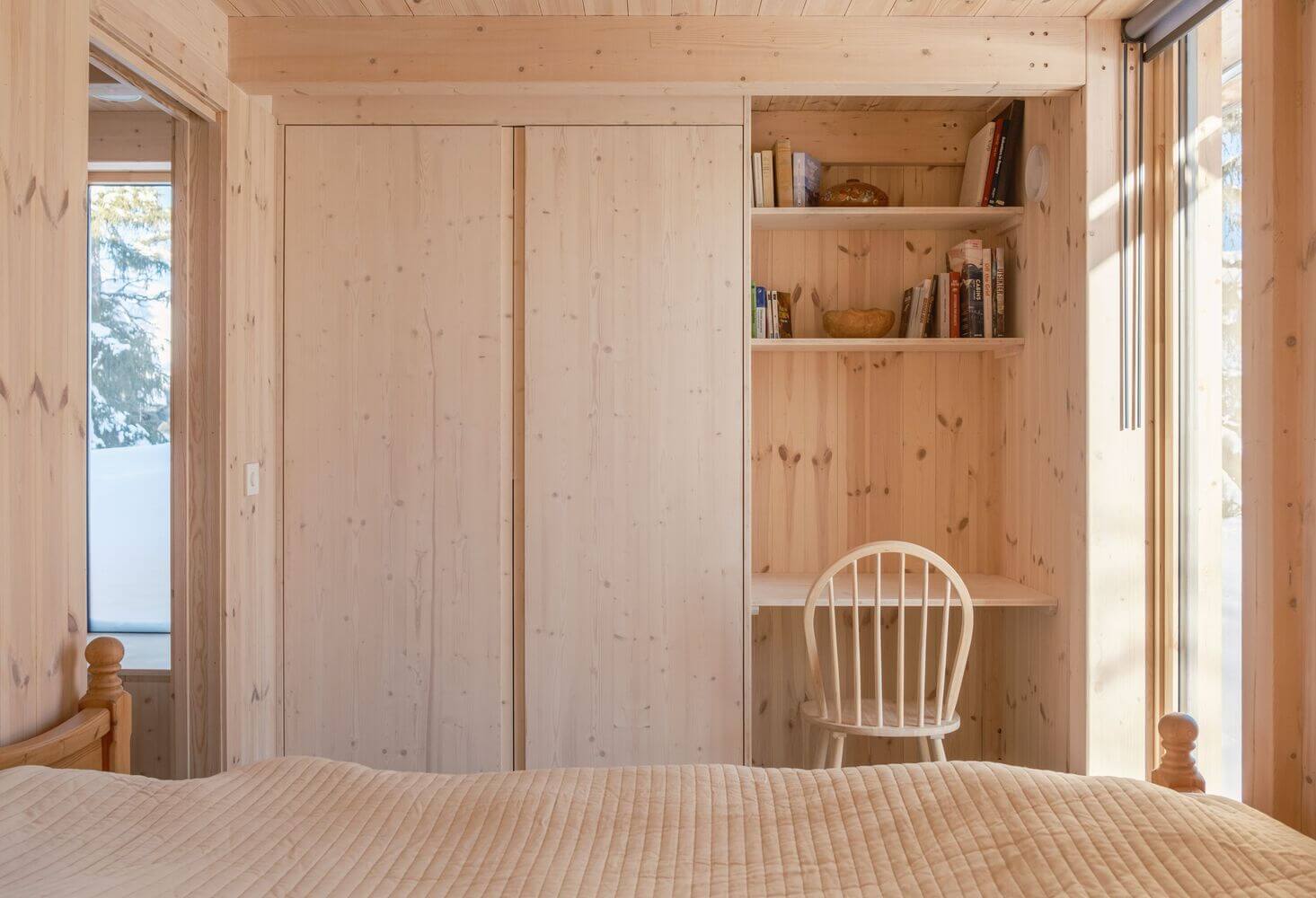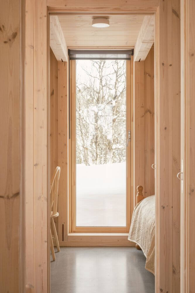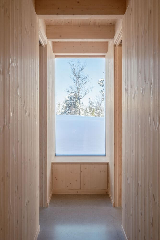 Objekt je v celom rozsahu navrhnutý ako drevostavba, čo je jasne čitateľné na jeho fasáde aj vo vnútorných priestoroch. Podľa architekta táto voľba materiálu nielen zakorení kabínu v jej okolí, ale vytvorí aj teplú, intímnu atmosféru vo vnútri, kde hladké borovicové obloženie navodzuje pocit pokoja a pohodlia.