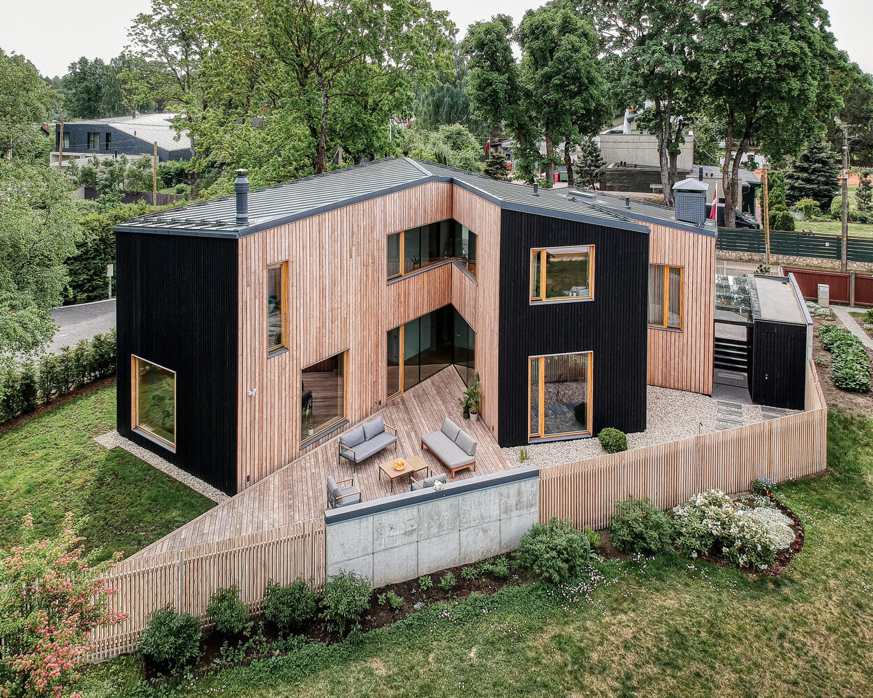 Ďalší zaujímavý rezidenčný projekt tohto druhu vznikol na lotyšskom pobreží. Ako hlavný konštrukčný materiál boli v tomto prípade zvolené CLT panely, ktoré ostali vo viacerých častiach domu priznané. Drevo preto výrazným spôsobom formuje atmosféru rodinného domu, ako aj jeho vonkajší vzhľad.