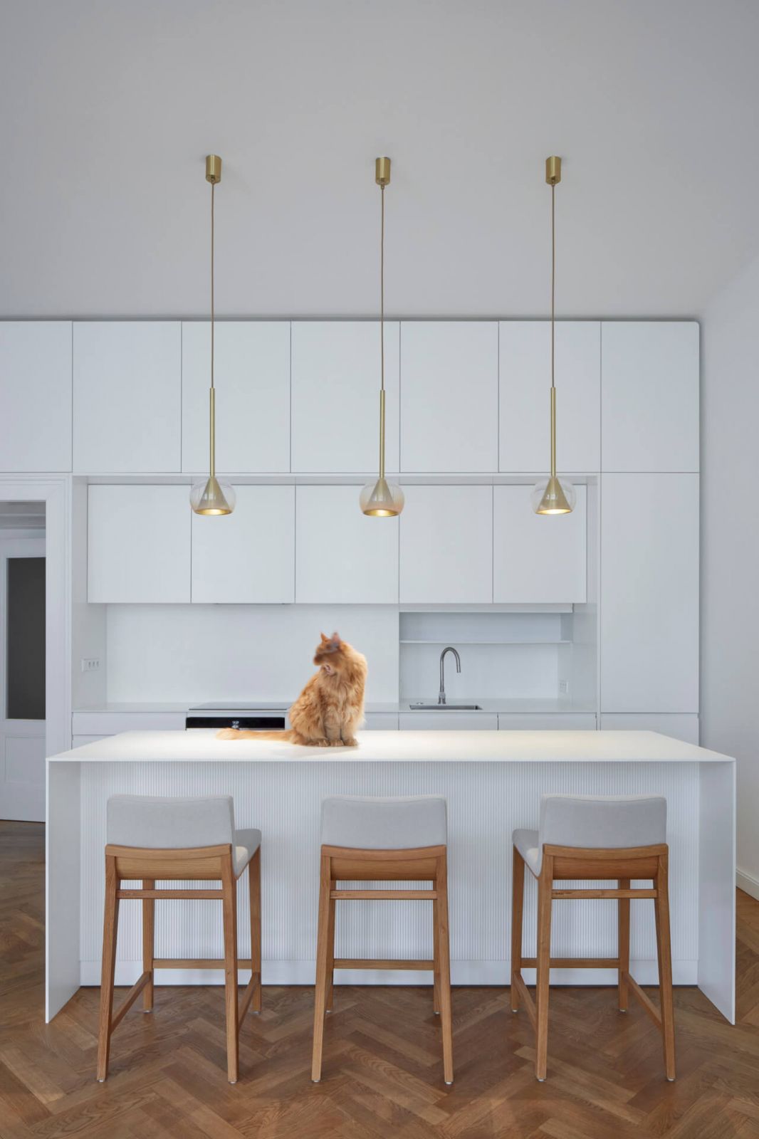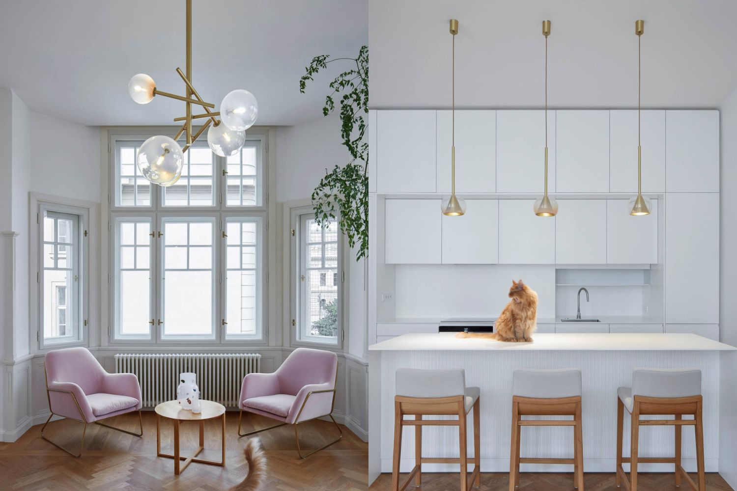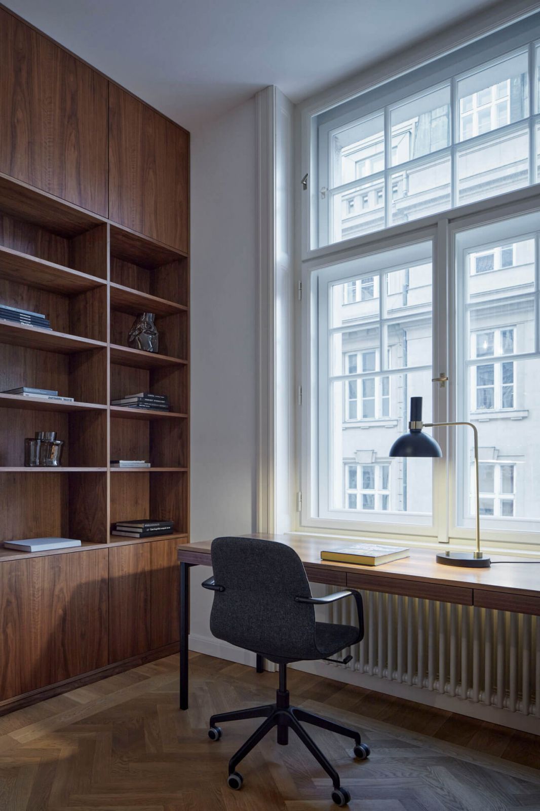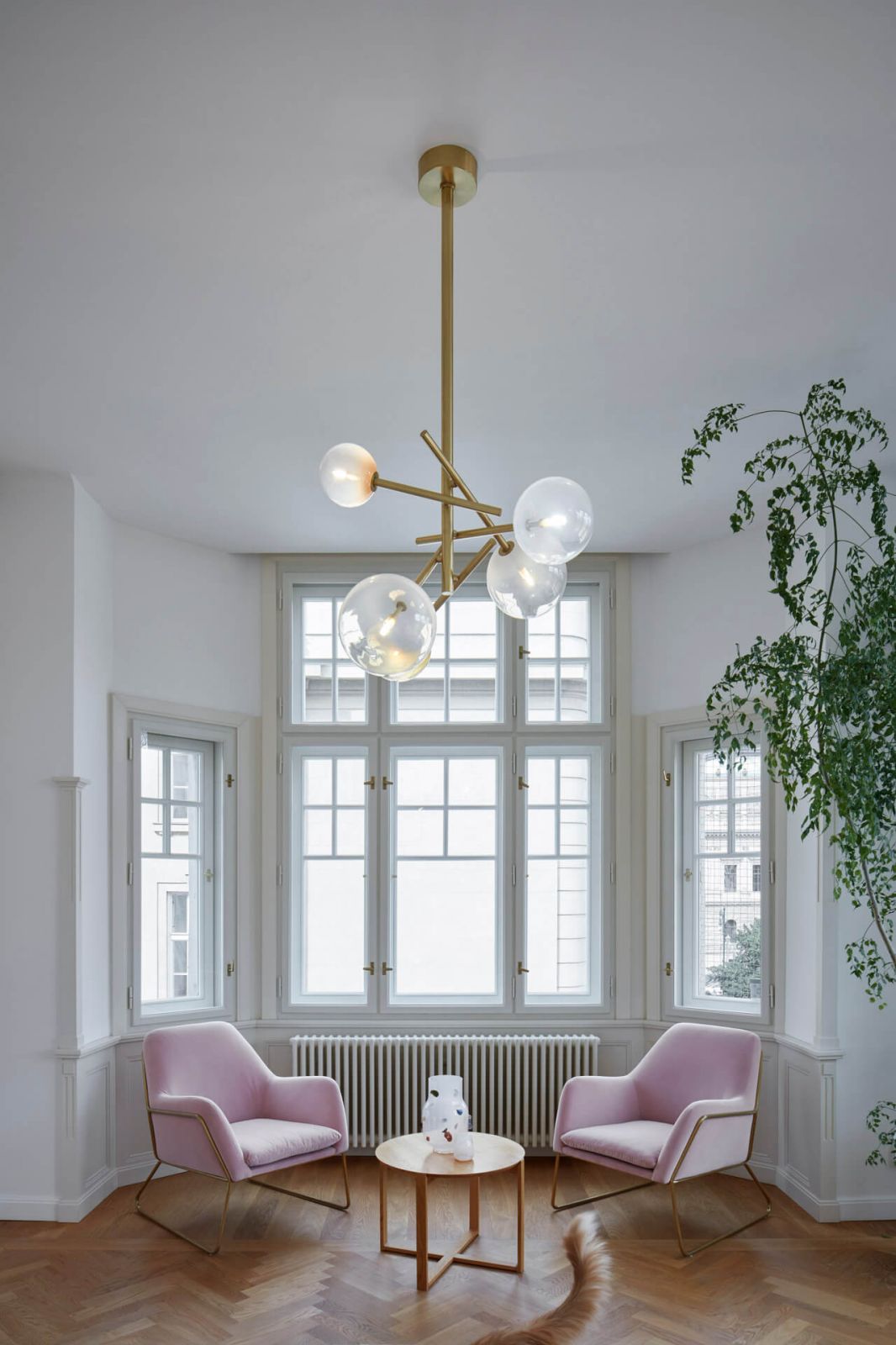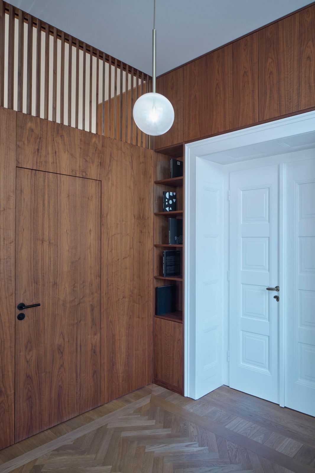 Atmosféru staromestského bytu architekti podporili drevenými stromčekovými parketami, zachovaním historizujúcich dvojkrídlových dverí a tiež výberom svietidiel a nových kusov nábytku. Pre tento projekt bolo dokonca na mieru navrhnuté svietidlo Kono od DECHEM studia, ktoré v roku 2019 získalo ocenenie za najlepšiu kolekciu svietidiel na Designbloku.