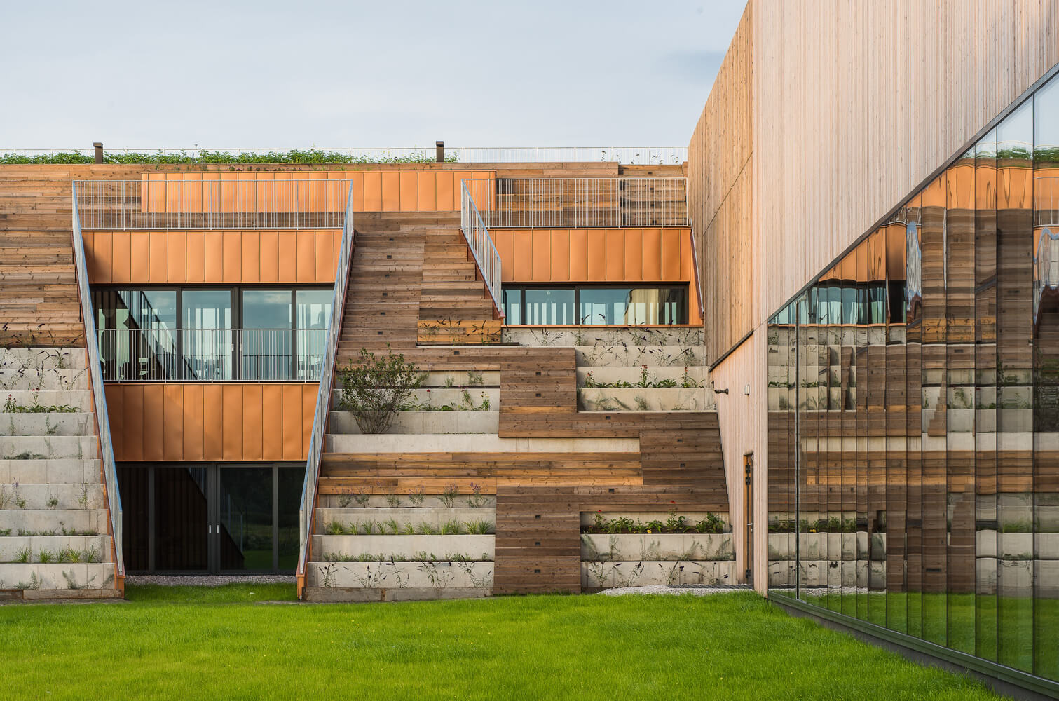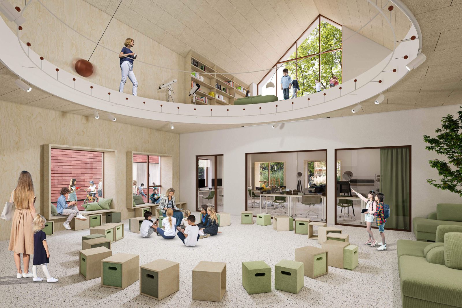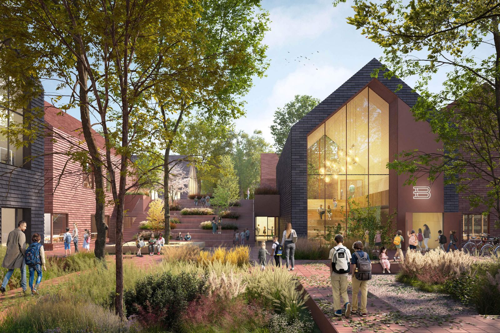 Kampus má byť totiž plne prístupný verejnosti. To v praxi znamená žiadne oplotenie a žiadne priestorové bariéry, brániace voľnému pohybu miestnych obyvateľov či detí, ktoré budú navštevovať školské objekty. Prírodné hodnoty krajiny ostanú podľa plánov zachované v čo možno najväčšom rozsahu. Počíta sa aj s podporou prírodného prostredia, a to novou výsadbou aj edukačnými aktivitami v exteriéri. „Táto moderná forma má podnecovať fantáziu žiakov a pedagógov a mobilizovať ich k tvorivým činnostiam. Otvorený priestor medzi budovami, bez múrov a obklopený prirodzenou vegetáciou pozdĺž hraníc pozemku pozve na stretnutia a trávenie času mimo múrov školy,” opisuje Przemo Łukasik.