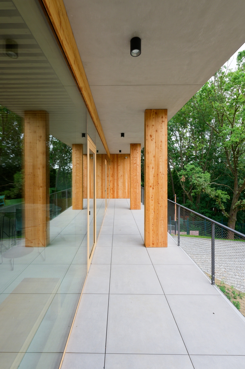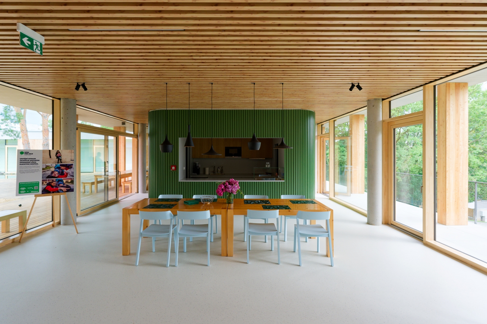 „Hlavná spoločenská miestnosť je pomyselne rozdelená na dve časti. Prednú sme navrhli ako verejnú zónu pre návštevy rodiny a priateľov. Priestor druhej časti bude slúžiť ako spoločenská miestnosť pre ubytované rodiny s miestom na hranie detí,“ tvrdia architekti.