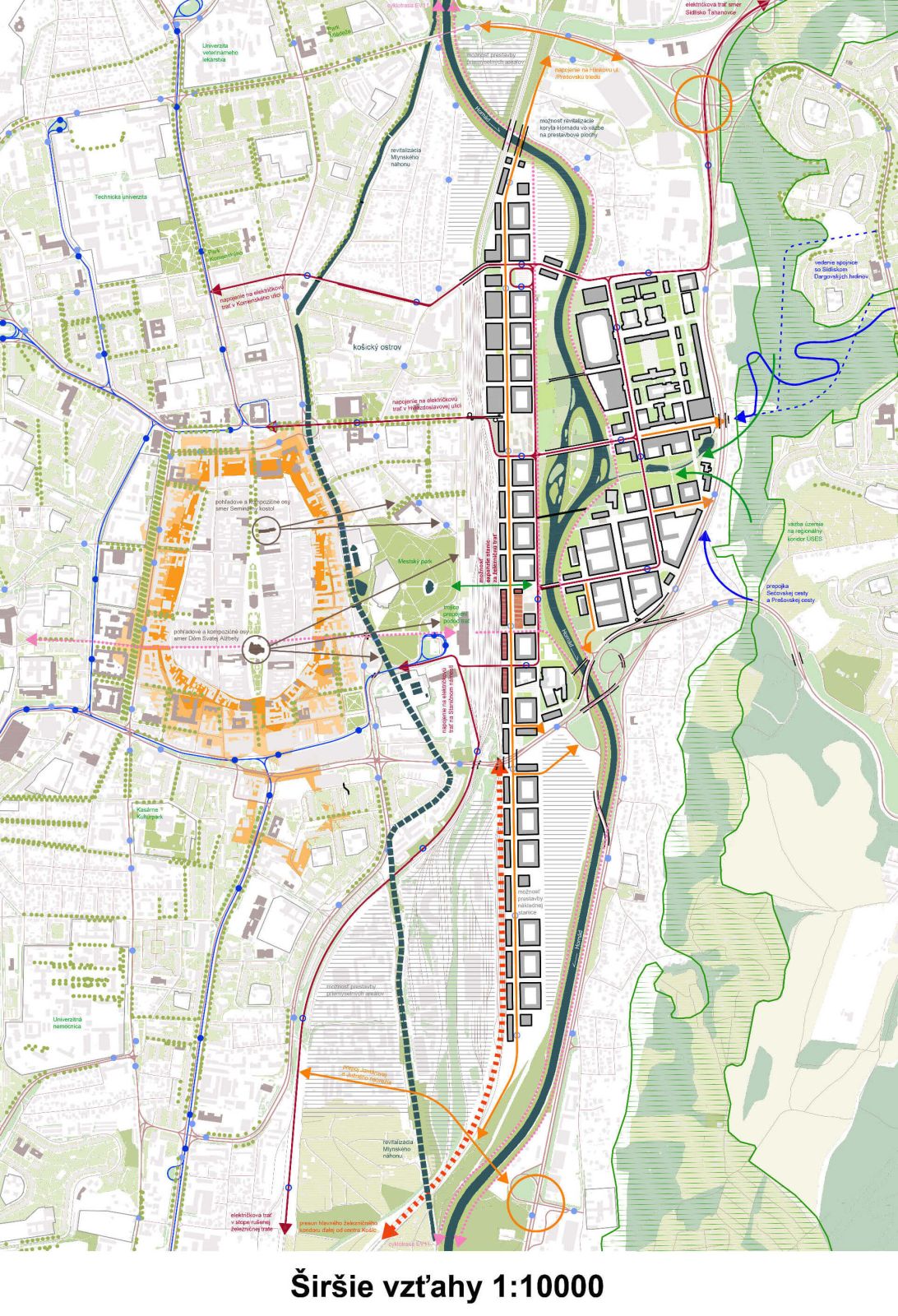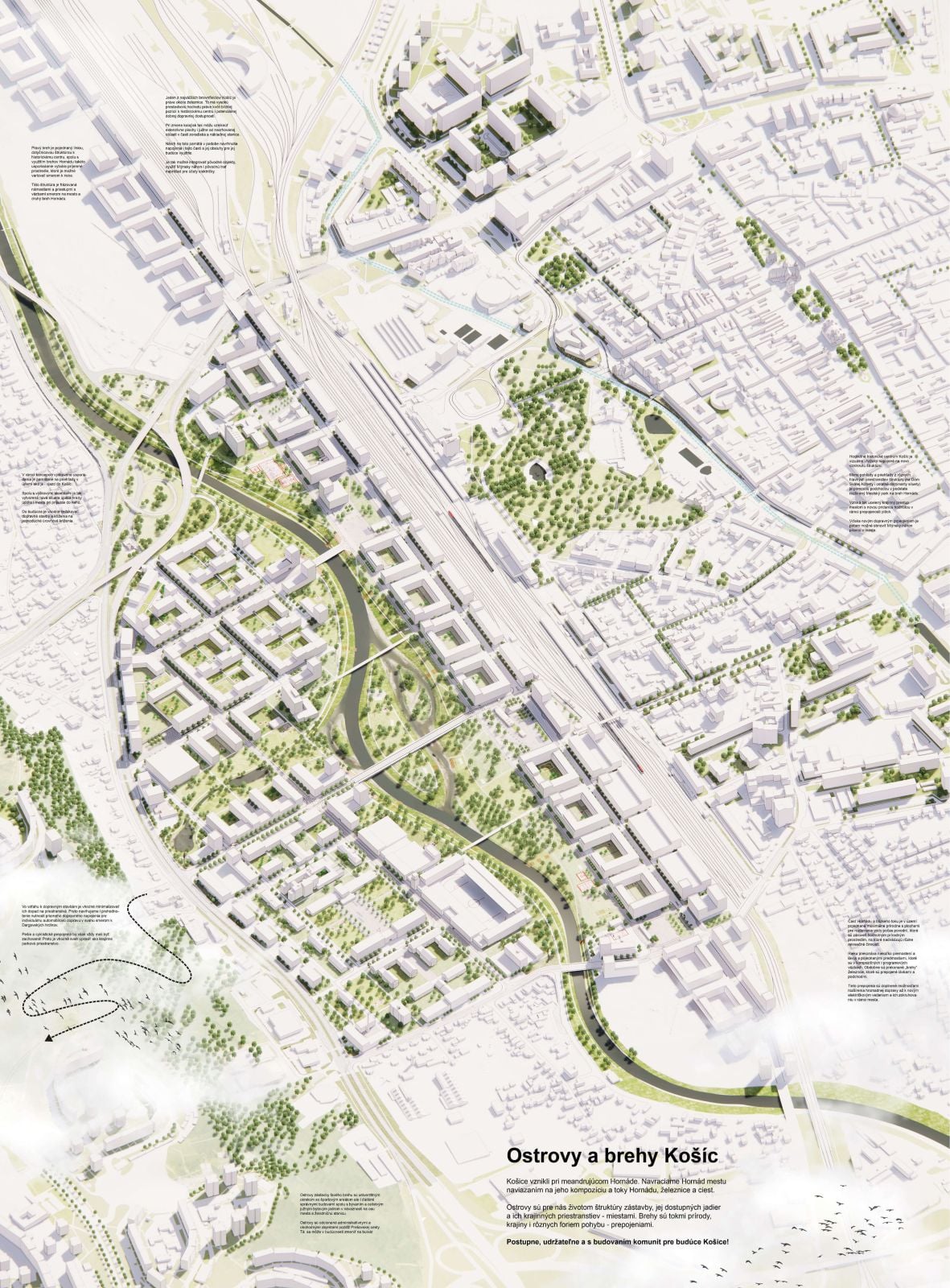Košiciam a ich novému centru by niečo také hroziť nemalo. Okrem pásu okolo Hornádu, ktorý ale môže byť parkom celomestského významu, sú ostatné priestranstvá komponované veľmi logicky. Zeleň je riešená ako stromoradia na ulici alebo umiestňovaná do vnútroblokov, ktoré sa môžu stať pokojnými oázami v rušnom prostredí. Na druhej strane, aj tento ruch je otázny, keďže mnohé priestranstvá sú očividne mienené ako pešie zóny. Navrhuje sa aj doplnenie verejnej dopravy, vrátane električkových tratí.