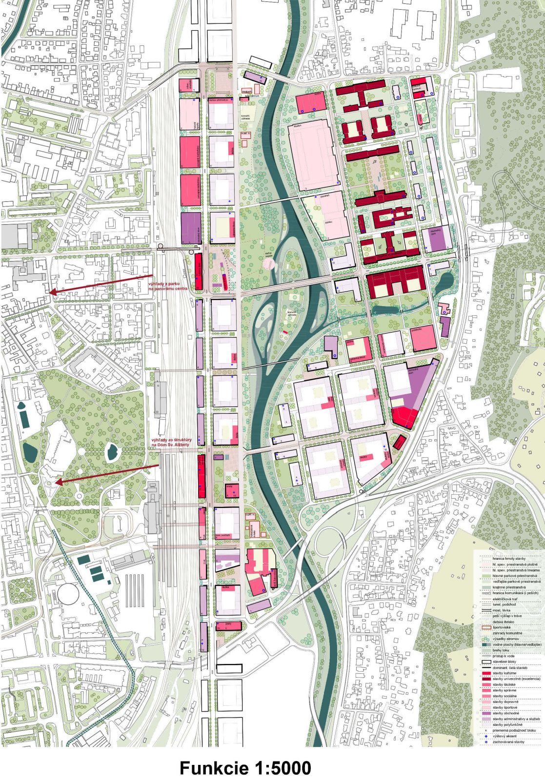 Hustota zaľudnenia by sa mala pohybovať medzi 100-300 obyvateľmi na hektár, čo možno označiť za optimum – pri kompaktnom blokovom meste je to v Prahe okolo 260 obyv./ha, pri sídliskách 180. Takéto množstvo umožňuje viac než efektívne využívanie verejnej dopravy, je zárukou dostatočného pohybu ľudí v uliciach a aj aktivácie mestského parteru. Z funkčného hľadiska pôjde o skutočný mix kľúčových mestských funkcií – bývania, administratívy, verejnej správy aj sociálnej vybavenosti. Vzniknúť tu môžu úrady, kultúrne centrá, školy, škôlky, domovy seniorov, naplánované sú športoviská aj retail, ideálne na prízemí domov. Architekti pracujú v záujme variability s členením blokov na menšie domy s rozličnými výškami.
