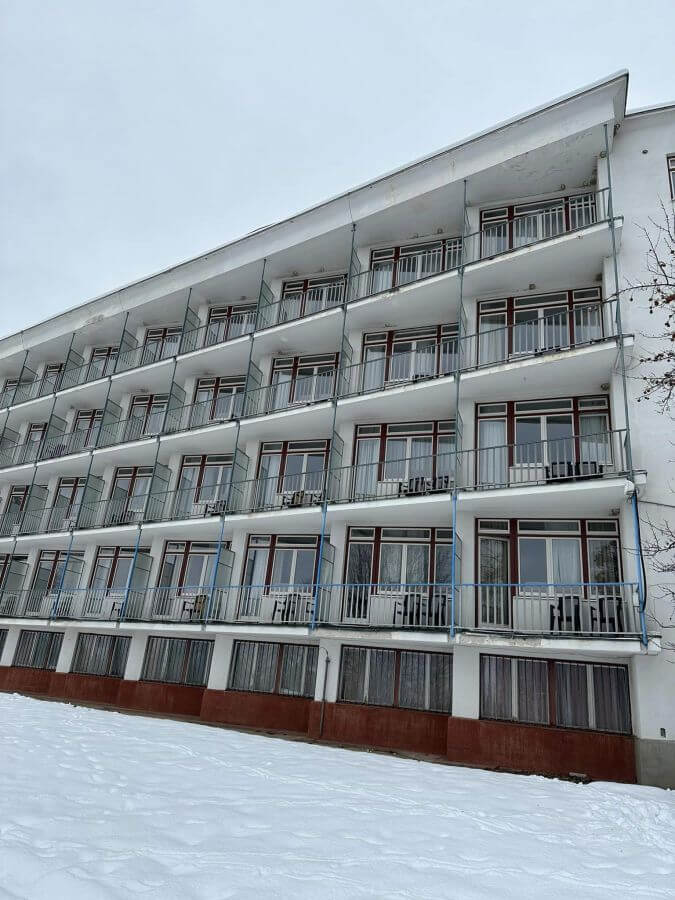 Hlavná fasáda ubytovacej časti hotela sa vyznačuje pravidelným rastrom okenných a dverných otvorov, na ktoré nadväzuje séria hlbokých loggií. Na rozdiel od ubytovacej časti sa spoločenská časť vyznačuje bohatou priestorovou a tvarovou artikuláciou. Oproti ubytovacej časti je aj o niečo nižšia. V jej priestoroch sa nachádza jedáleň, klubovňa a kaviareň. Súčasťou spoločenskej zóny je aj séria otvorených a krytých terás. Použité tu boli tiež výrazné a dlhé pásové okná.