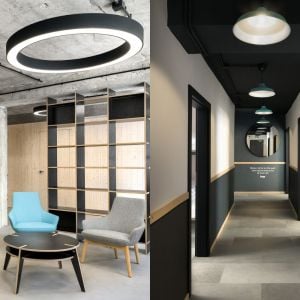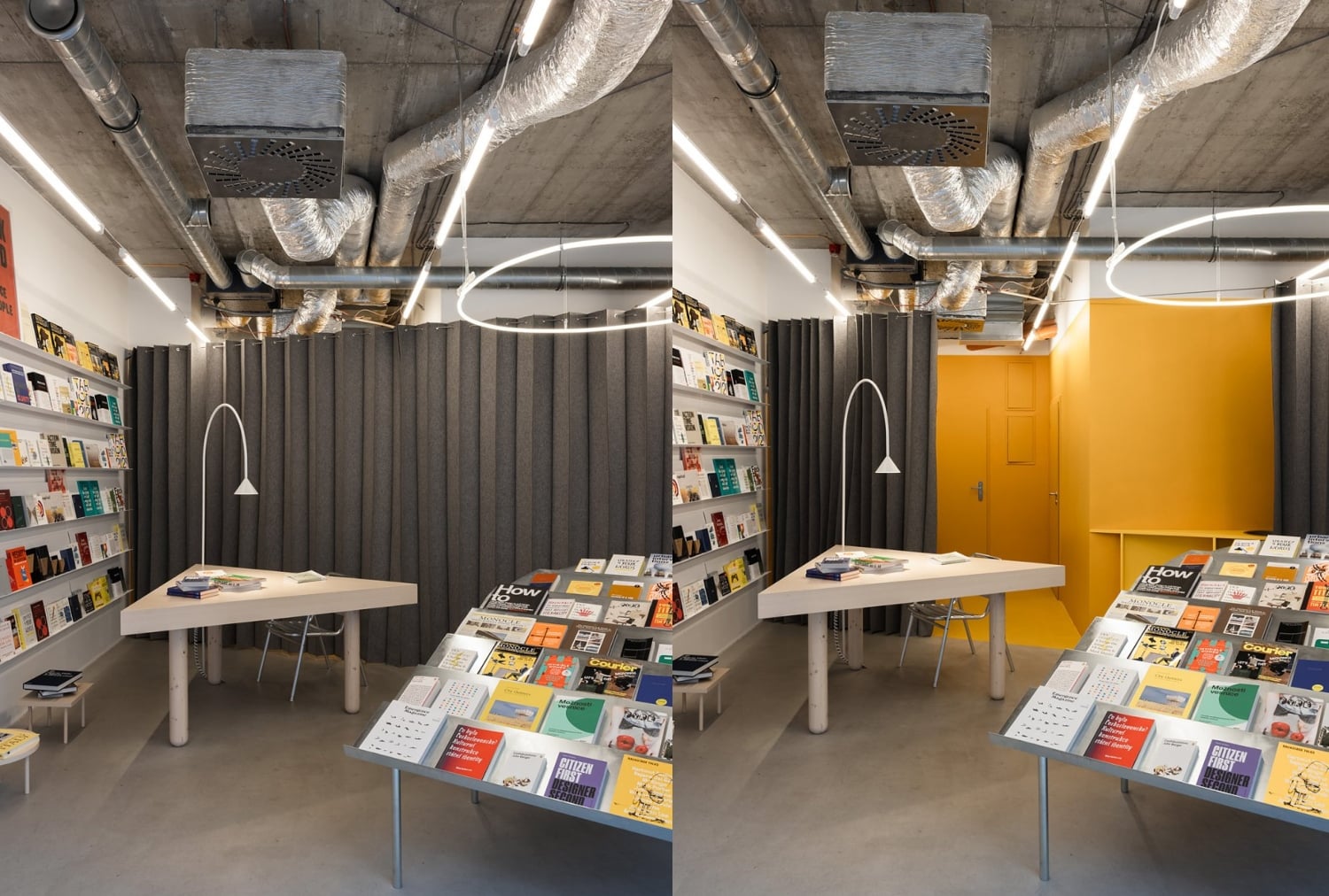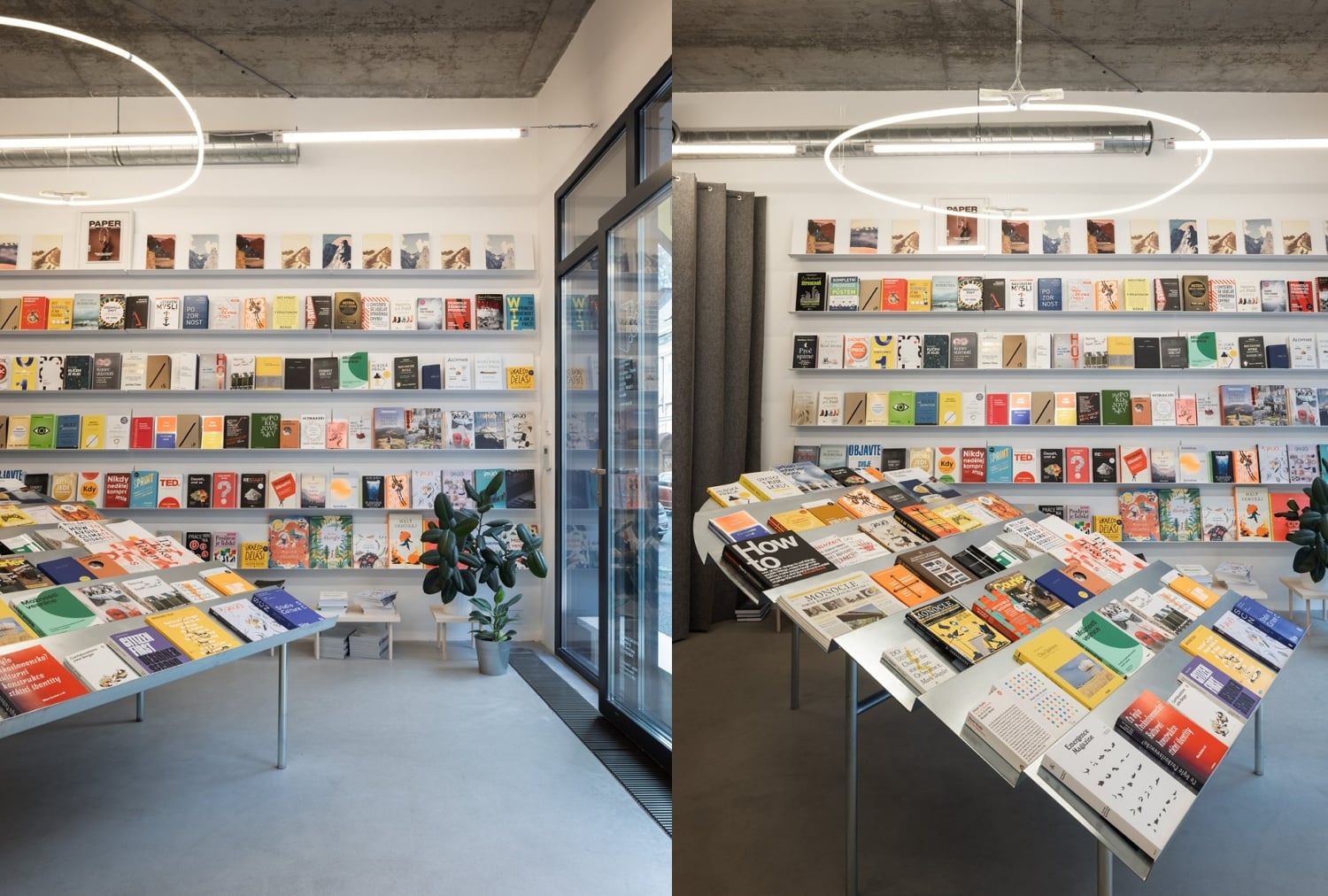 Policové výstavné systémy na stenách poskytujú dostatok priestoru pre knihy, pričom tituly nájdeme aj na zaoblenom pulte, ktorý je spolu s pokladňou umiestnený po stranách obchodu. Zaujímavá je aj rôznorodosť materiálov, pričom pulty sú z metalického materiálu, ale aj z dreva, doplnené subtílnymi podnožkami a taburetmi zo svetlého dreva. Tie zároveň poukazujú na hravosť interiéru, keďže majú viacero tvarov.