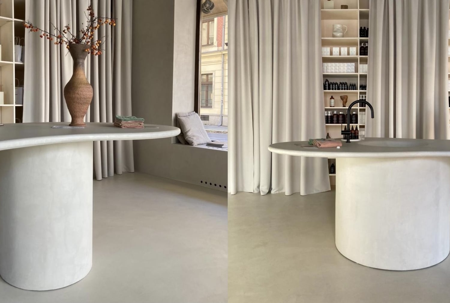 Funkčné zariadenie predajne ďalej pozostáva už iba z úložiska v svetlom odtieni dreva, strategicky umiestneného na celej ploche steny oproti vstupu. Záves, ukrývajúci potrebné predmety, tak podporuje organické tvary interiéru a svojim riasením aj jeho dynamiku. Detailom, ktorý vhodne narúša jednoliatosť priestoru, sú čierne akcenty ako drezová batéria, či samotné produkty značky.