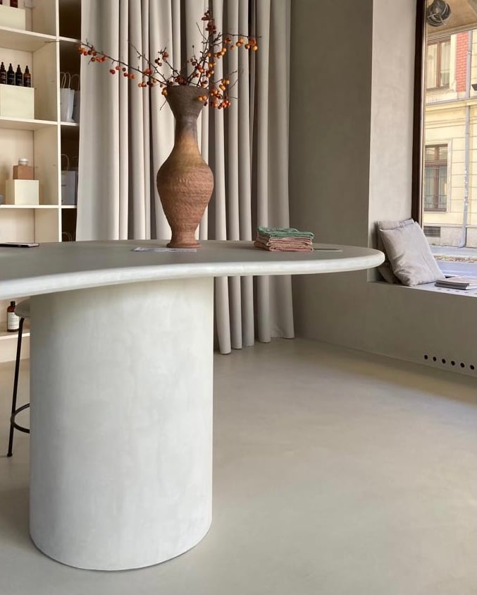 Tie definujú atmosféru priestoru a udávajú mu jasný tón. Puristicému konceptu predajne vhodne dominuje výrazný, centrálne umiestnený pult z liateho betónu. Zaujímavý tvar vrchnej dosky, ktorá sa jemne vinie v priestore, umožňuje nielen plynulý pohyb po interiéri, ale zároveň aj opticky odľahčuje hmotu ostrova.