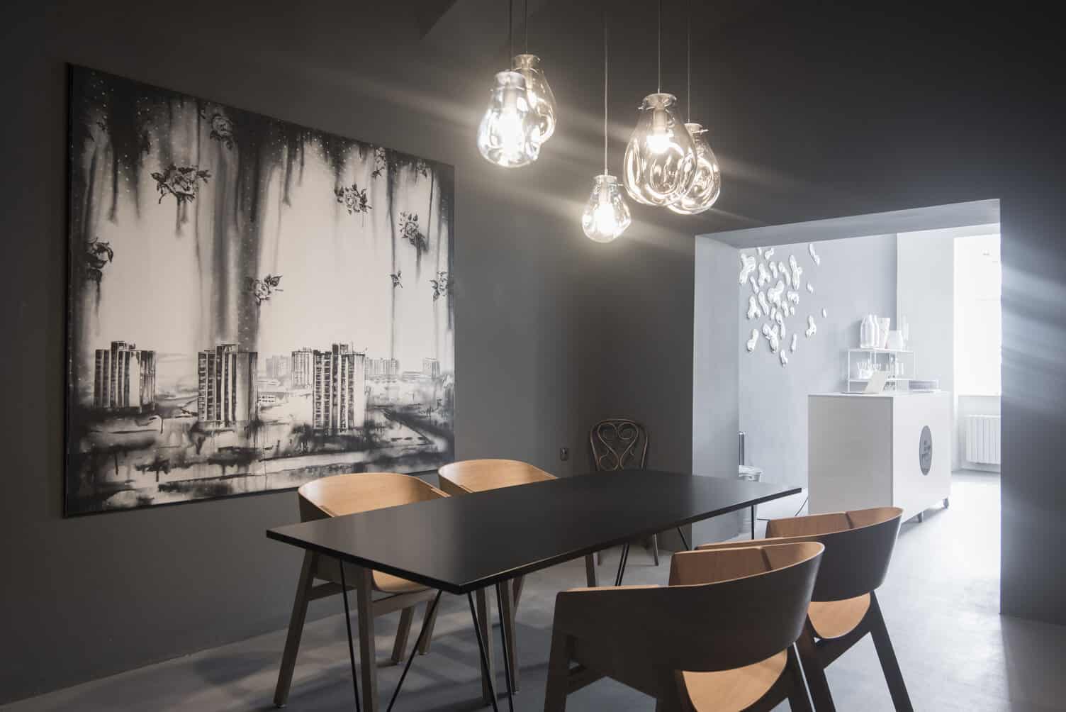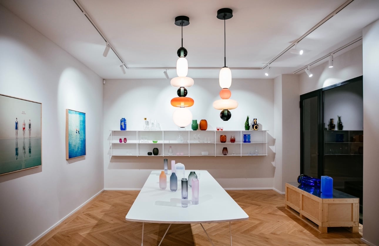 Inak jednoduchý priestor, v ktorom vynikajú klenbové stropy, uzemňuje sivá podlaha a centrálne umiestnené prezentačné stoly. Biela farebnosť ustupuje výraznejšie ladeným dizajnérskym predmetom. Pôvodná predajňa, ktorá stojí svojim dizajnom taktiež za zmienku, vynikala kontrastným zázemím predajne. Jej zadná miestnosť bola flexibilne využiteľná nielen pre administratívu, ale aj konzultácie nakupujúcich. Steny a strop pokryté antracitovou farbou dramaticky zvýrazňoval obraz Lucie Tallovej, podporujúci premyslené detaily zariadenia.