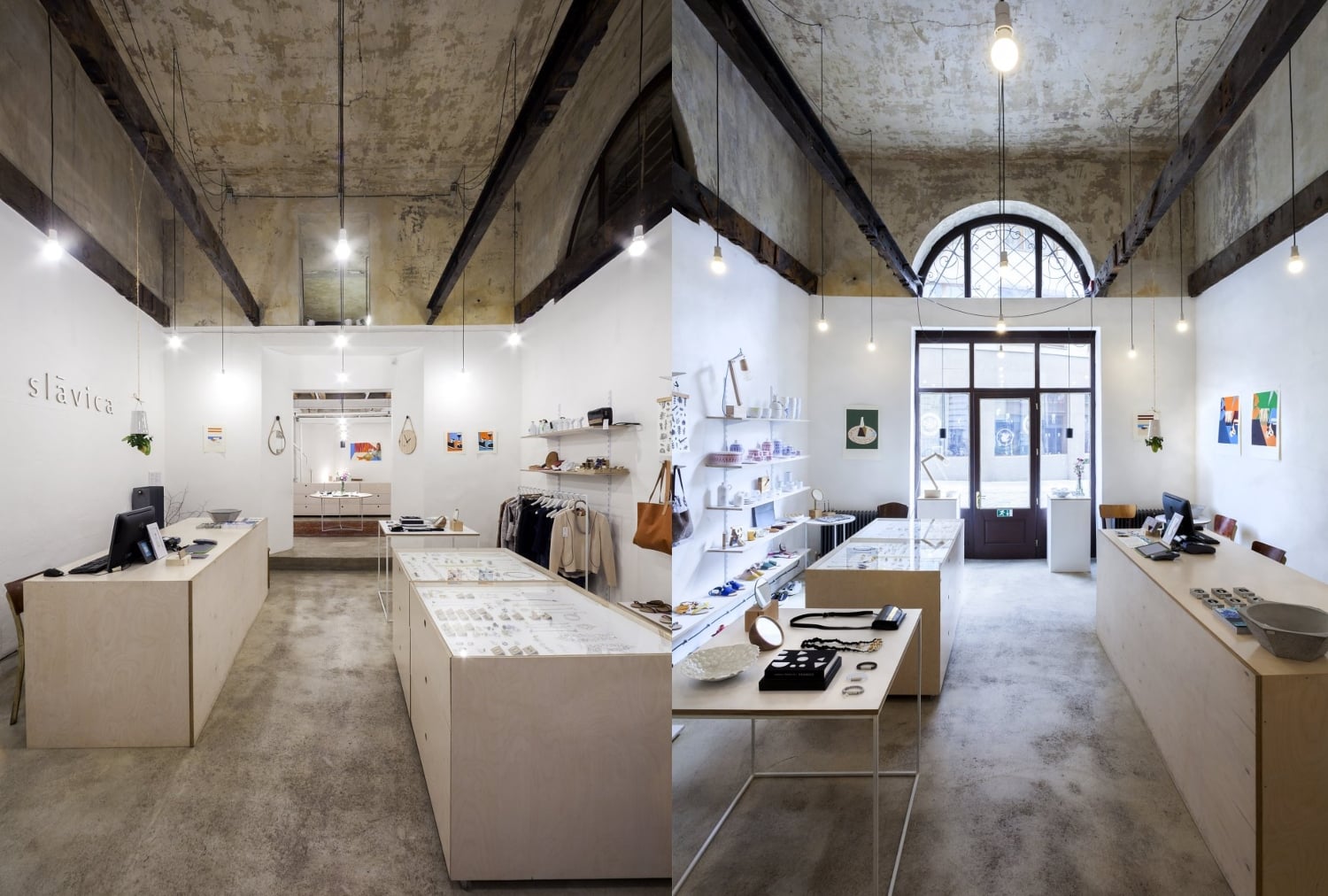 Zámerom Slávice je prinášať výber, možno povedať že až kurátorský, remeselných, umeleckých a dizajnových objektov. Cieli na predstavenie slovenských a českých produktov, ako sú plagáty, úžitkové keramiky, šperky ale aj módne doplnky od lokálnych dizajnérov a umelcov. Širokej ponuke obchodu tak bolo potrebné prispôsobiť aj priestory. Autorský dizajn, ktorého domovom je koncept Slávica, je umiestnený prevažne na preglejkovom nábytku vo svetlej farebnosti. Unikátnosť produktov, často vyrobených v limitovanom množstve, sa odráža aj v dizajne interiéru, ktorý okrem svojrázneho materiálu zariadenia pracuje s neutrálnou farebnosťou.