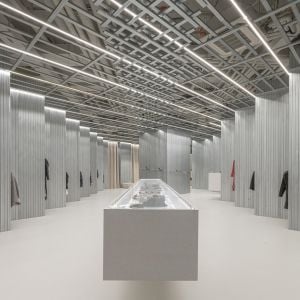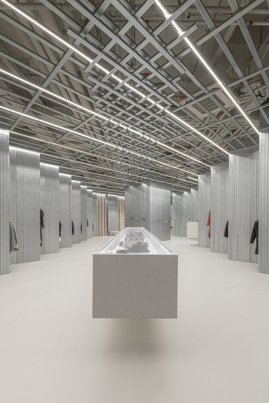 Jednoduché materiálové zloženie kompenzujú ostré línie nábytkových blokov aj chladné chrómové prvky, strategicky rozmiestnené tak, aby vytvárali optickú ilúziu.Stropné konštrukcie však svojou nenápadnou formou nechávajú vyniknúť tovar, nepôsobia teda násilným dojmom. Priestor získal unikátny charakter, ktorý pôsobí príťažlivo a sofistikovane, no zároveň ukazuje hravý spôsob, ako formovať interiér predajne zameranej na zážitok nakupujúceho.