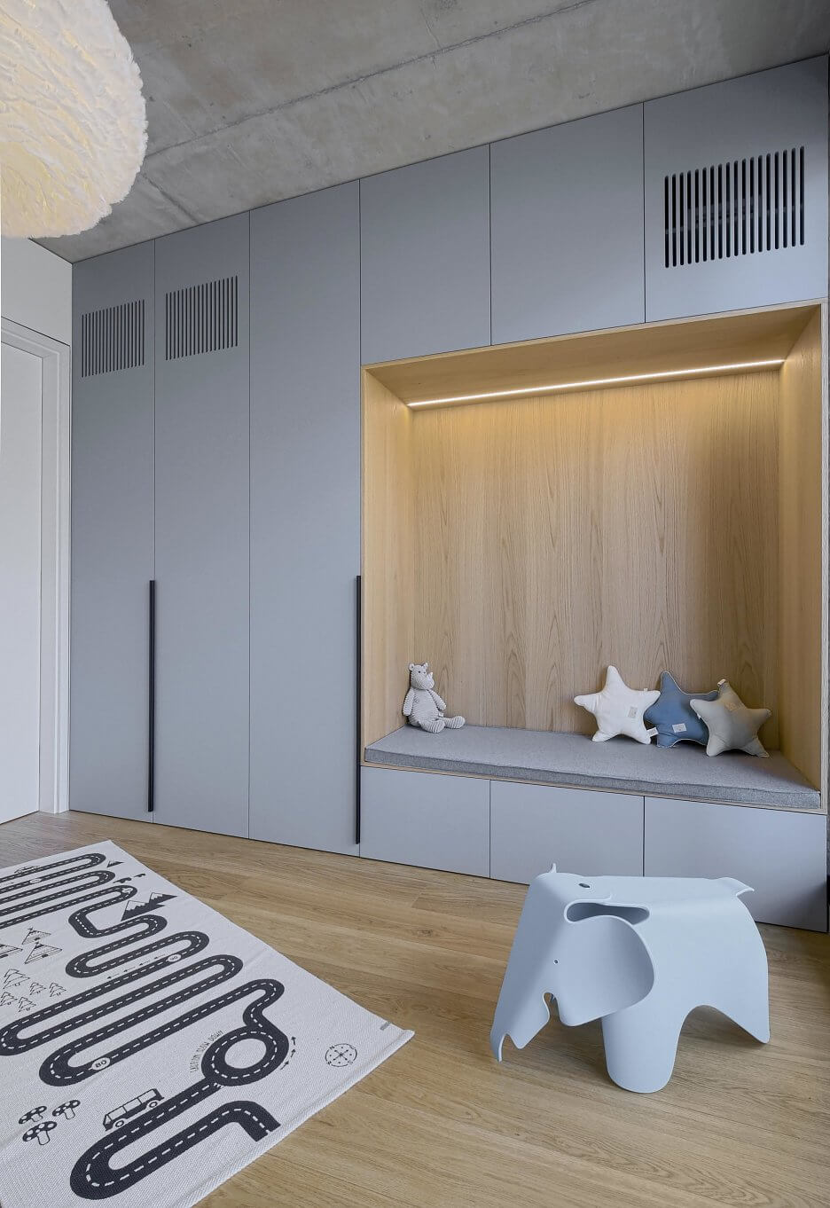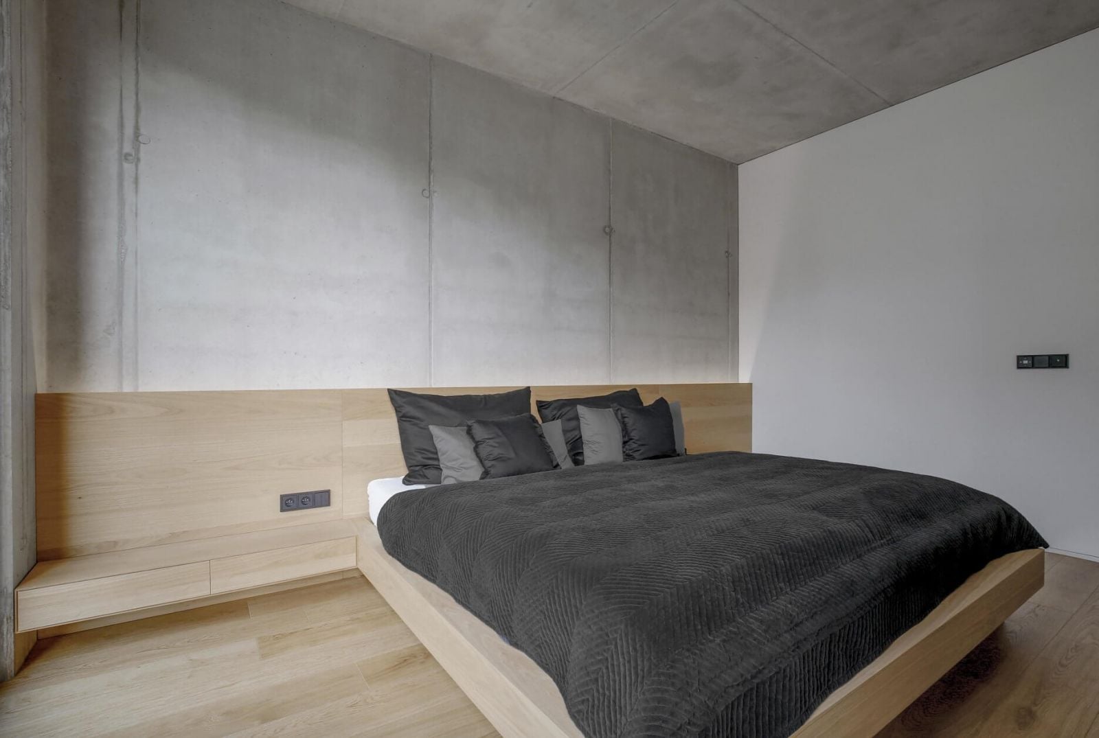 Hlavnej spálni dominuje na mieru navrhnutá drevená manželská posteľ. V detskej izbe nájdeme úložný priestor kombinovaný so zapusteným kútom na sedenie a ľahko vymeniteľnú detskú posteľ v tvare domčeka. Aj v týchto izbách ostal priznaný pohľadový betón, ktorý dopĺňa nábytok na mieru v sivých a drevených tónoch a čierne detaily. To isté platí aj pre vstupnú halu s dostatkom úložného priestoru a dlhým taburetom na sedenie.