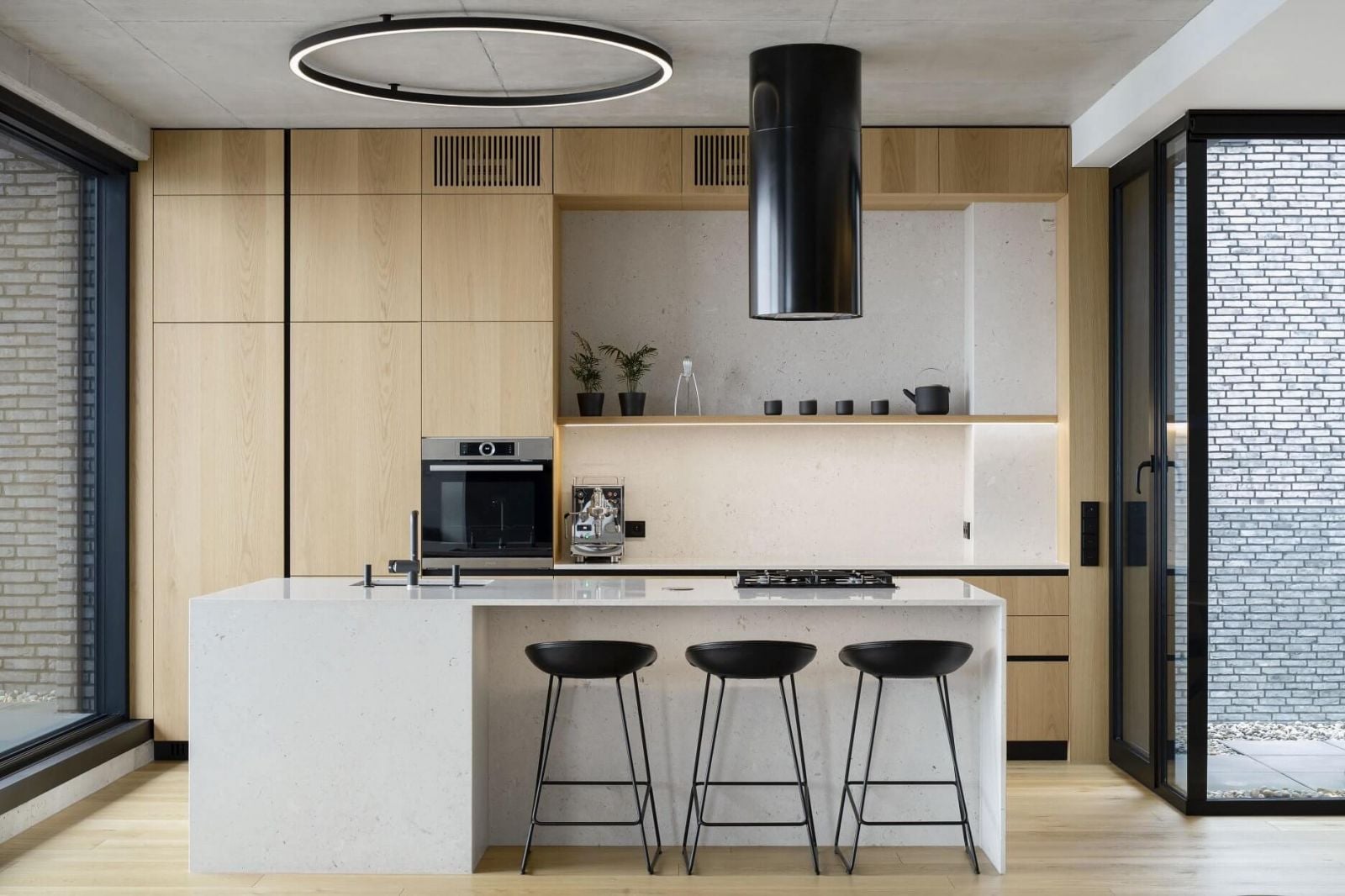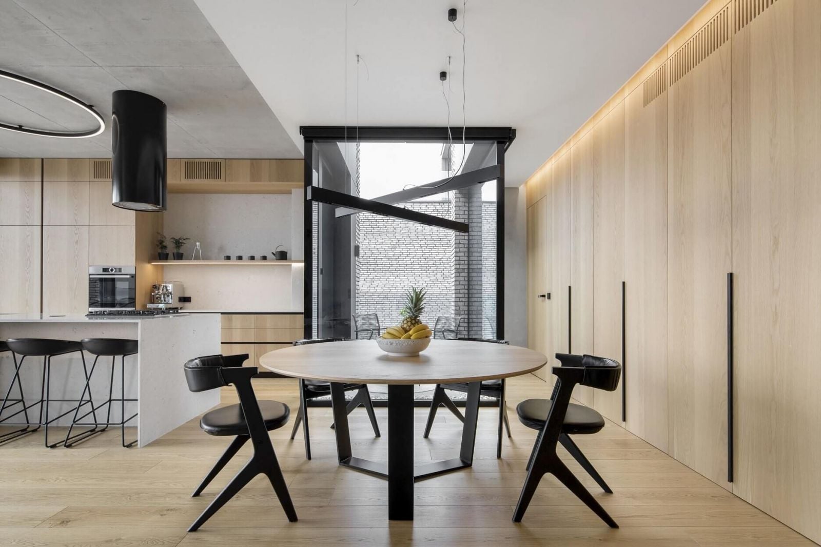 Kuchynská linka okrem dostatku úložného a pracovného priestoru disponuje aj barovým sedením. Doplnkový úložný priestor možno nájsť v časti za jedálenským stolom. Úložné skrine tu navyše plynule pokračujú vo forme obkladu, ktorý za sebou ukrýva menšiu špajzu. K príjemnej atmosfére prispieva jeden z troch balkónov, ktorý vnáša denné svetlo do jedálenskej časti. Nad stolom sa týči dvojica závesných svietidiel čiernej farby.