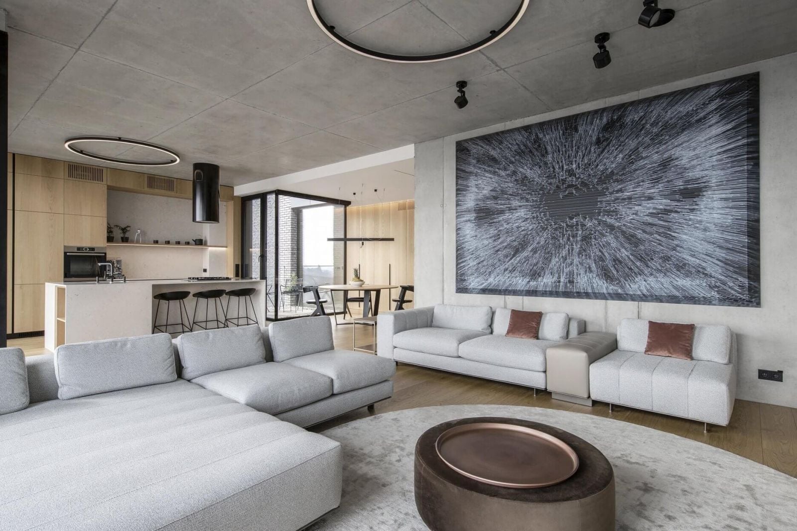 Minimalistické poňatie interiéru necháva v celej dennej miestnosti vyniknúť špecifickým solitérom, ako je jedálenský stôl, veľkoformátový obraz či modulová sedacia súprava. Z materiálového hľadiska sa celý byt nesie v kombinácii pohľadového betónu, teplého dreva a prírodného kameňa. „Nie je rušivá a dáva možnosť sústrediť sa na umelecké diela a krásny výhľad na Bratislavu,“ tvrdia architekti.