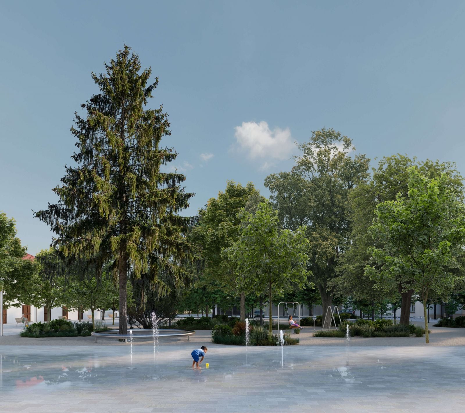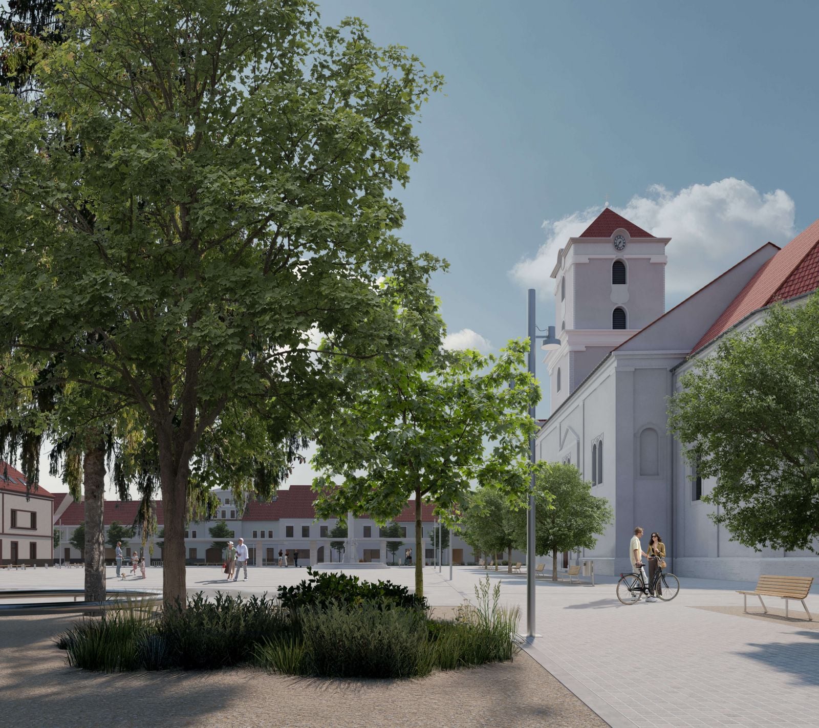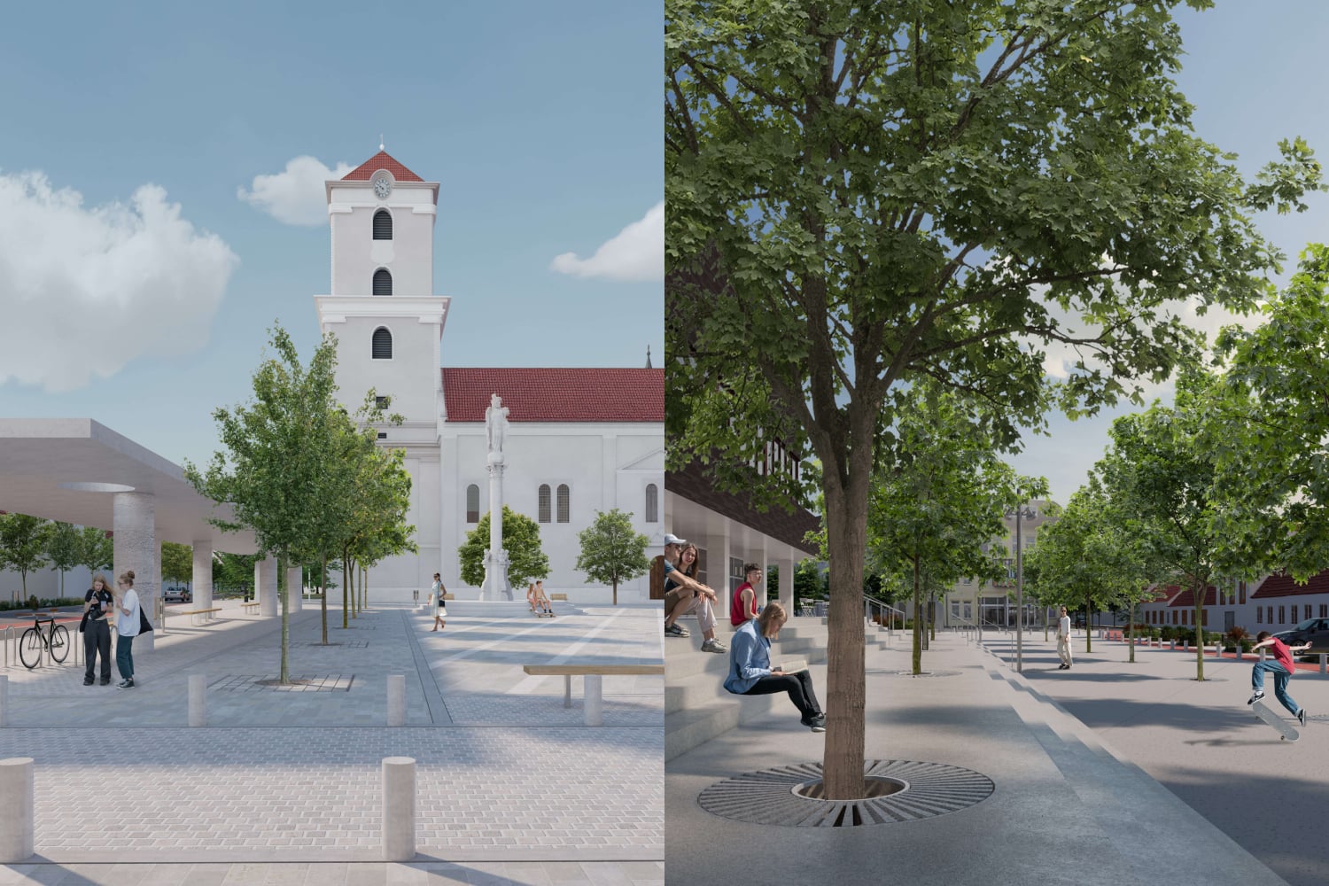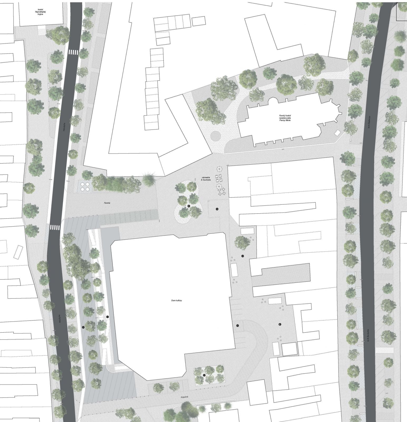 Najvýznamnejším priestranstvom je prirodzene Radničné námestie, tvorené dvomi časťami – spevnenou, vytvárajúcou priestor pre rozličné podujatia, a parkovou. Ide o zámerný kontrast, ktorý má pripomínať, že dôležitý je priestor pre demokratické aktivity aj plocha, ktorá pomáha zmierňovať následky zmeny klímy. Na historické miesto sa má vrátiť morový stĺp, doplnený bude nový sokel a pobytové schody. V parku sa navrhuje mlatový povrch, doplnené má byť nové stromoradie.