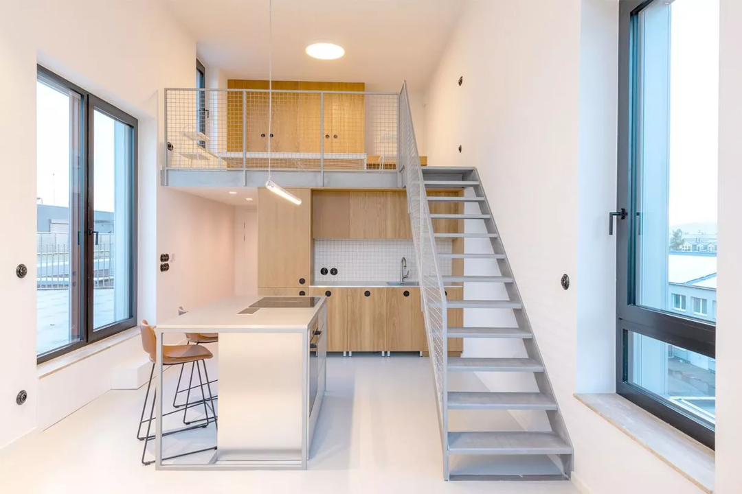 Presvetlenie, ktoré zásadne formuje kvalitu vnútorných priestorov, dopĺňa prevetrávanie a akustický komfort, všetko dosiahnuté rohovými dispozíciami bytov. Časť „komína” vyniká dvoma loftovými bytmi so svetlou výškou stropov takmer šesť metrov, pričom ich výhodou sú aj terasy so zelenou strechou.