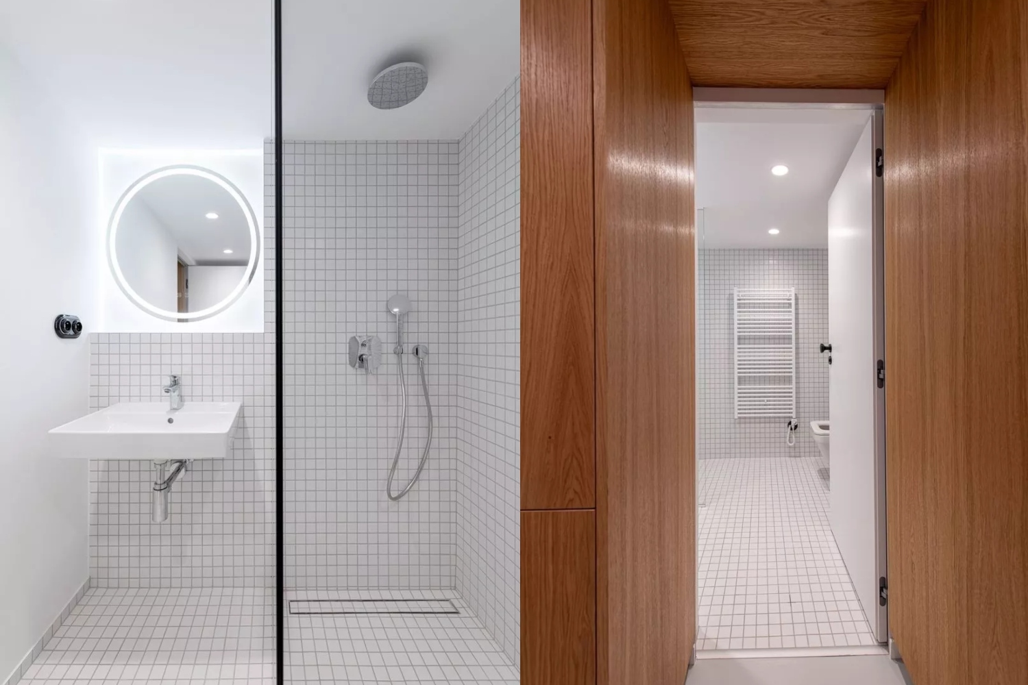 Masívny materiál, odkazujúci na kvalitné riešenia aj v spoločných priestoroch domu, vidno aj na kuchynskej linke. Dubové drevo svojou úrovňou a neutrálnosťou flexibilne vyhovie väčšine záujemcov, rovnako ako hygienické zázemie v odtieňoch bielej, do ktorého sa vstupuje cez skryté dvere chodbovej zostavy. Ostatné dvere taktiež pracujú so skrytými zárubňami.