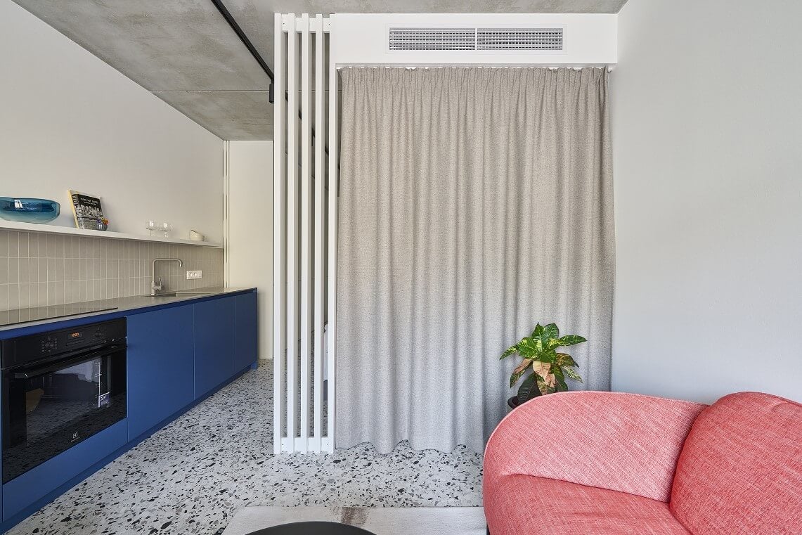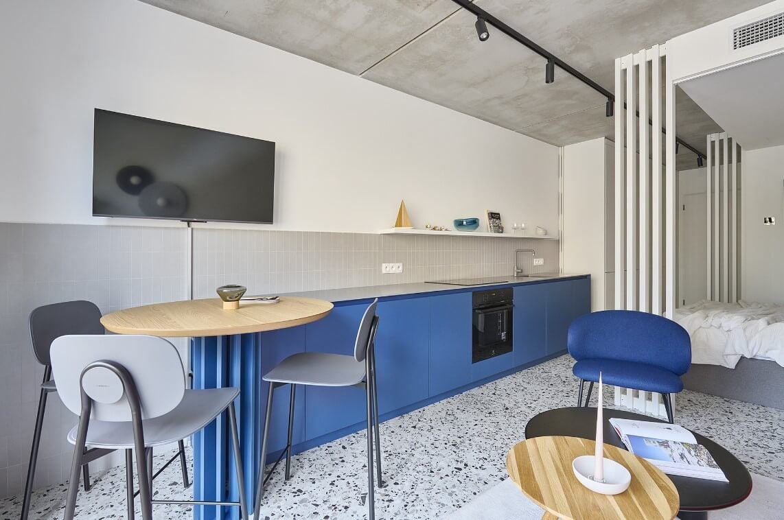 Opačná strana miestnosti patrí kuchynskej linke. Tá bola vzhľadom na úzky priestor navrhnutá v tvare I. Kuchynská linka nedisponuje hornými skrinkami, vďaka čomu pôsobí celá miestnosť opticky odľahčene. Na strane v blízkosti balkóna kuchynskú linku uzatvára jedálenské sedenie. „Taktiež sa tu opakuje motív lamiel, ktoré spolutvoria identitu apartmánu,“ upriamujú dizajnéri pozornosť na detail v podobe lamelovej nohy stola. Pri vstupe boli, pre zmenu, navrhnuté vysoké úložné priestory.