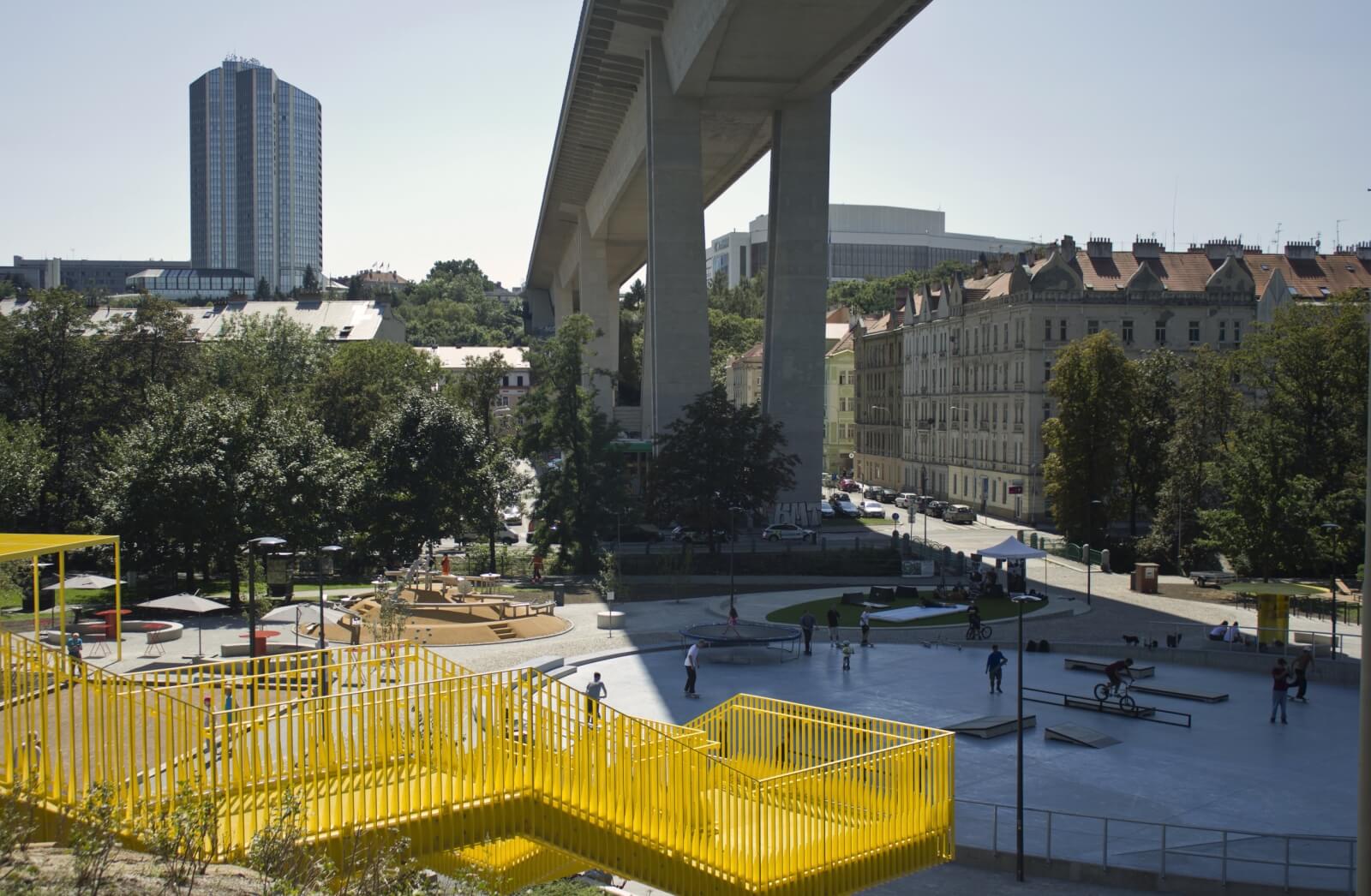Súčasťou nedávno otvoreného areálu sú športové ihriská, priestor na cvičenie jógy, ping-pongové stoly aj interaktívny vodný prvok. Dominantou priestoru je viacúčelová plocha, ktorá od jari do jesene slúži najmä kolieskovým športom. V zime sa plocha mení na klzisko pre verejné korčuľovanie. Z hľadiska materiálového riešenia autori projektu používali rôzne odtiene farebného betónu, čo areálu vo výsledku dodalo špecifickú atmosféru.
