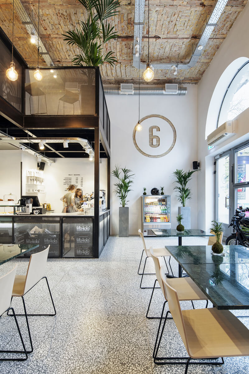 Kombinácia priznaného betónu, odkrytých tehlových stien a kovu tu vytvára jedinečnú atmosféru. Zeleň a modré detaily v podobe čalúnenia a iných dizajnových prvkov zas celému priestoru pridávajú na útulnosti. Vďaka celopreskleným klenutým portálom zas interiér dobre komunikuje s ruchom ulice.