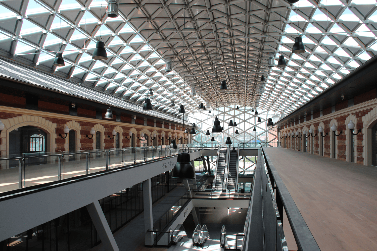 Jej architektonický koncept spája historické sklady z 19. storočia s modernou sklenenou konštrukciou, ktorá pripomína kostru veľryby. Dominantným prvkom budovy je presklená oceľová konštrukcia, ktorá zabezpečuje dostatok prirodzeného svetla a zároveň vytvára dynamický vizuálny efekt.