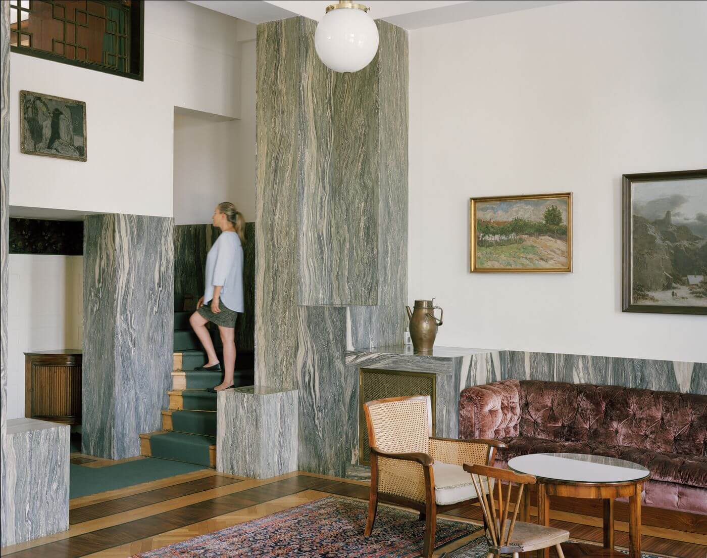 Jedáleň je obložená zeleným mramorom a pôsobí takmer chrámovo, zatiaľ čo knižnica je intímna, obložená teplým drevom a vybavená vstavanými policami. Nábytok v mnohých prípadoch navrhol sám Loos – ide o zabudované skrine, lavice, sedacie súpravy, zrkadlá a svietidlá, ktoré do priestoru prirodzene zapadajú. Obzvlášť pozoruhodné sú riešenia prechodu medzi miestnosťami – niektoré sú otvorené bez dverí, inde ich Loos maskuje alebo dokonale integruje do stien. Každý detail v interiéri je premyslený, funkčný a esteticky čistý.