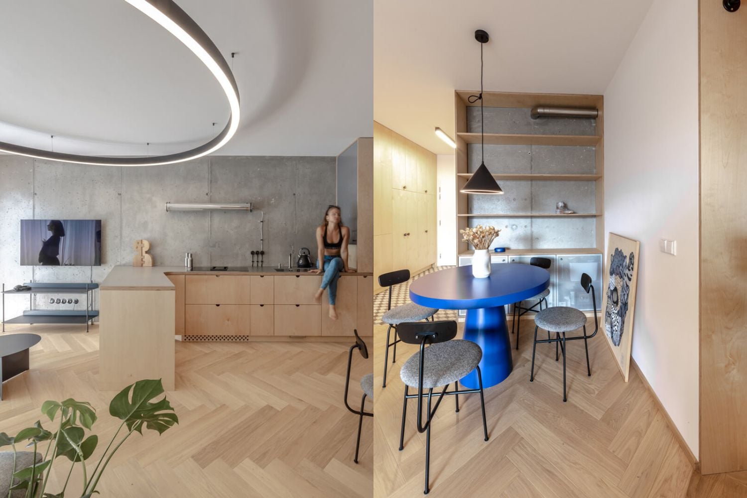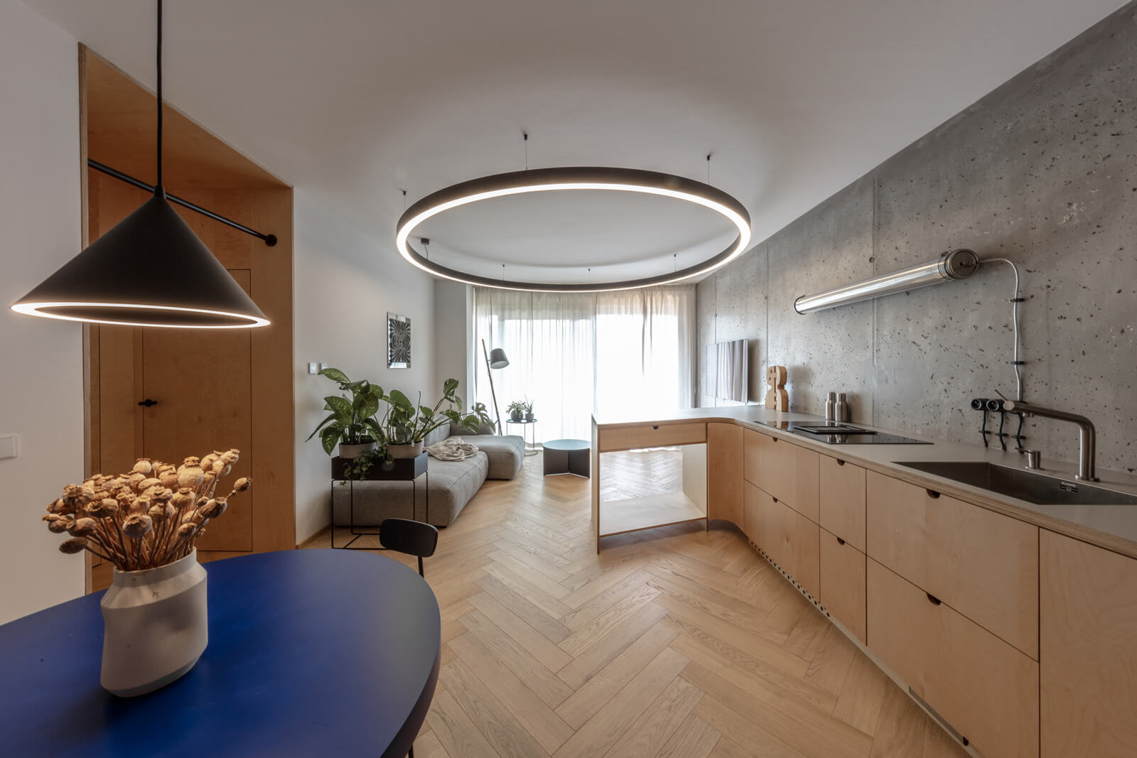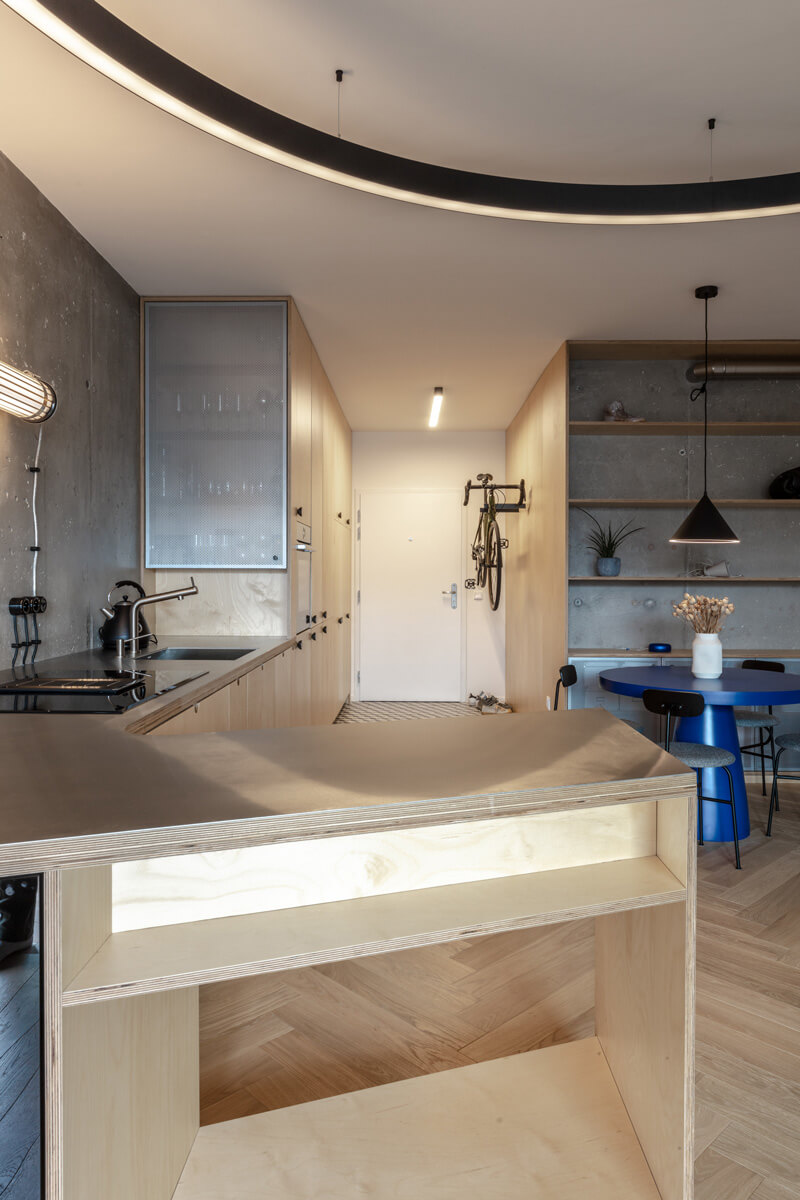 Industriálny nádych sa premieta do materiálového konceptu, ktorý spája surový betón, kovové prvky, nerezovú oceľ a brezovú preglejku. Práve tá tvorí jednotiaci prvok naprieč celým bytom a prepája jednotlivé miestnosti do koherentného celku. Výber tlmených odtieňov, kombinovaný s prírodnými textúrami, dotvára uvoľnenú atmosféru a zároveň zvýrazňuje architektonickú logiku návrhu.