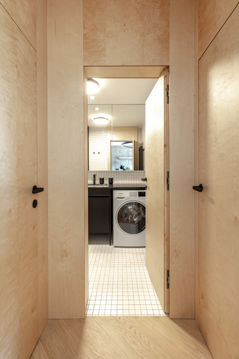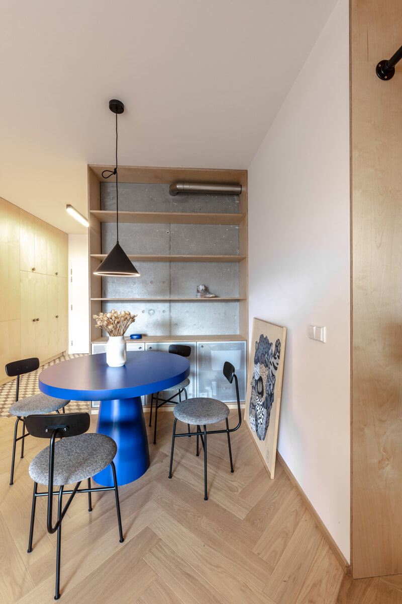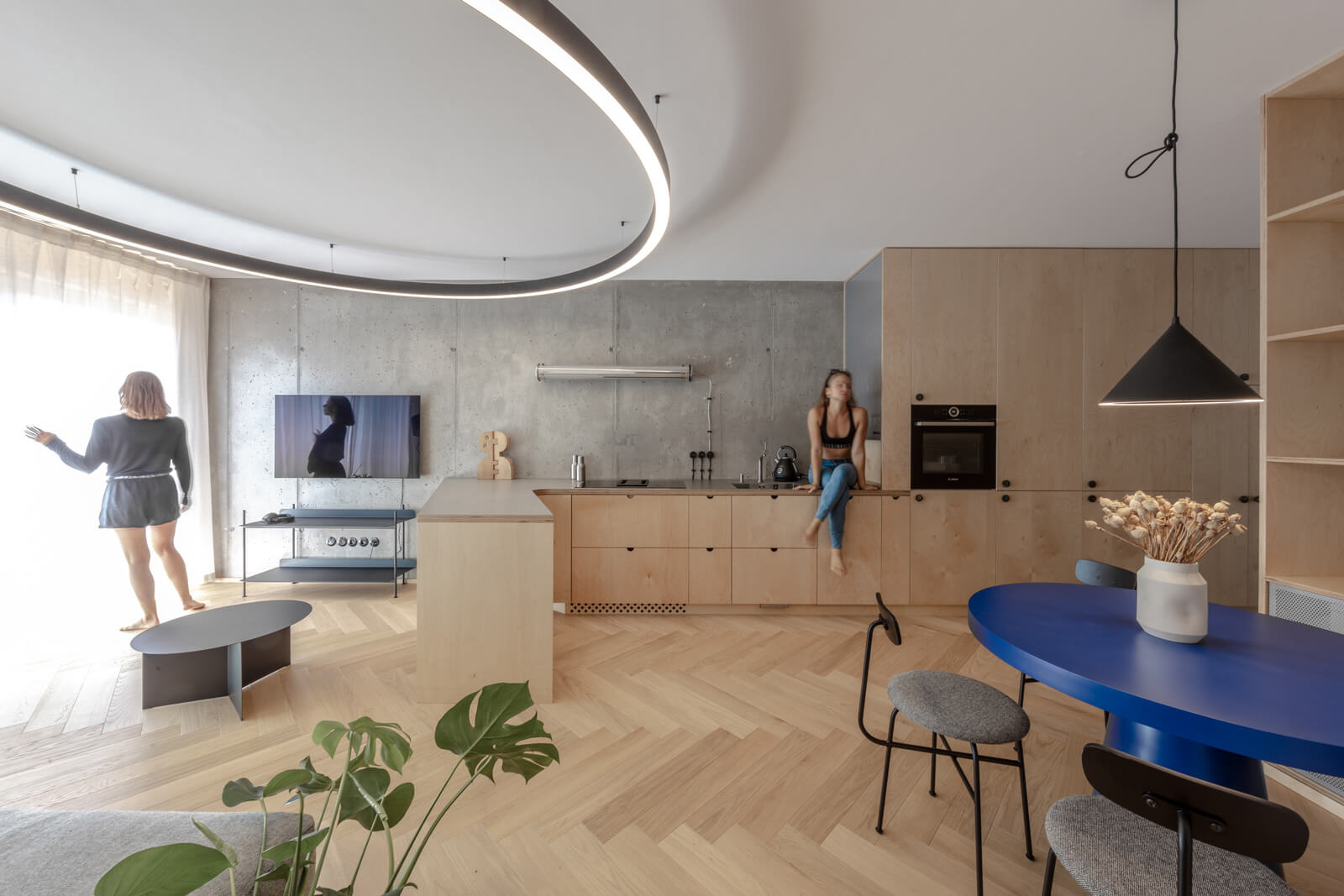 Industriálny nádych sa premieta do materiálového konceptu, ktorý spája surový betón, kovové prvky, nerezovú oceľ a brezovú preglejku. Práve tá tvorí jednotiaci prvok naprieč celým bytom a prepája jednotlivé miestnosti do koherentného celku. Výber tlmených odtieňov, kombinovaný s prírodnými textúrami, dotvára uvoľnenú atmosféru a zároveň zvýrazňuje architektonickú logiku návrhu.