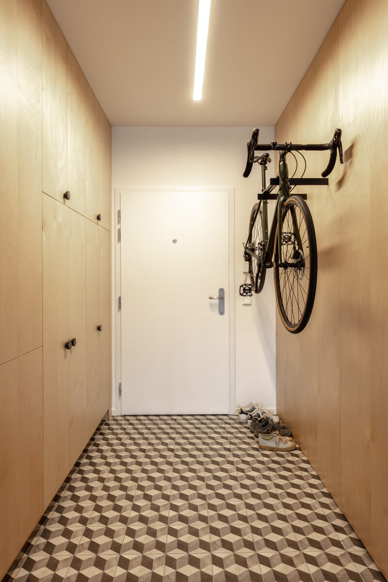 Srdcom vstupnej haly sú nenápadne navrhnuté úložné priestory, ktoré plynule pokračujú až do dennej miestnosti. Opačnú stenu sa architekti rozhodli v návrhu obložiť veľkoformátovým obkladom z brezovej preglejky. Podlaha vo vstupnej hale, rovnako ako tá v kúpeľni a toalete, bola navrhnutá v čierno-bielej keramickej dlažbe s geometrickým vzorom.