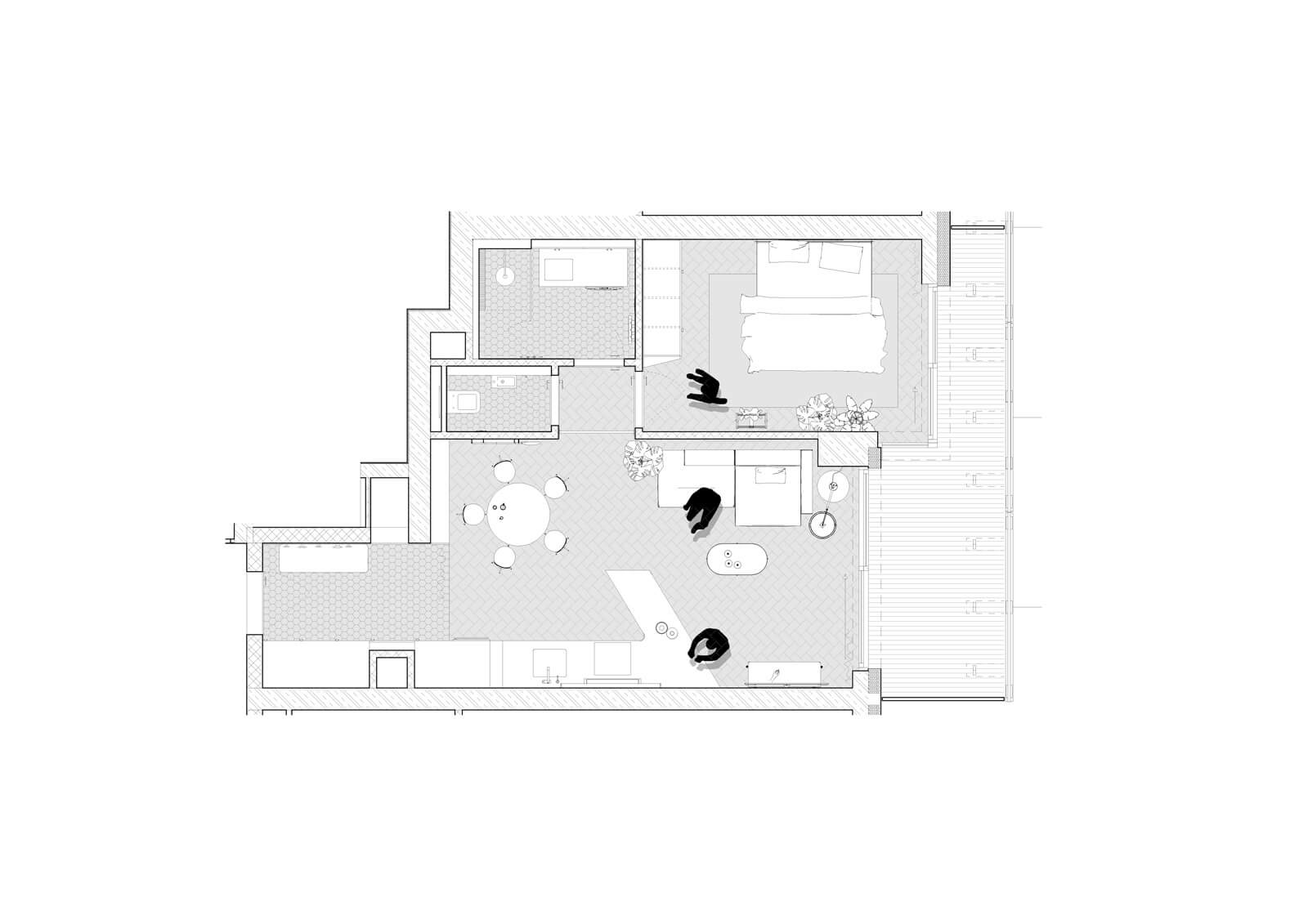 V dennej miestnosti tento materiál vystriedali dubové parkety. Svetlé drevo následne v byte tvorí aj značnú časť nábytku na mieru. Doplnené je klasickým bielym stropom a stenami z priznaného betónu. „Byt mal v ideálnom prípade obsahovať prvky industriálneho dizajnu s nie príliš surovými riešeniami,” približujú materiálový koncept autori návrhu.