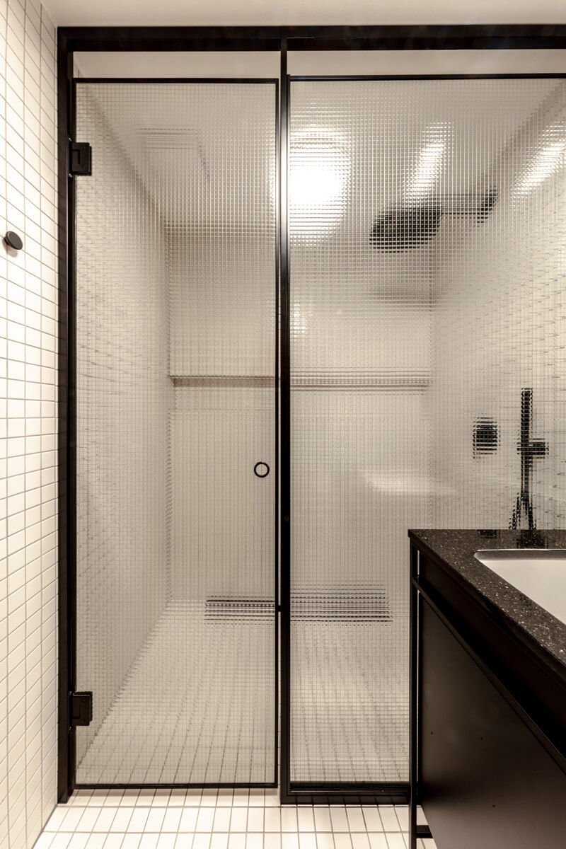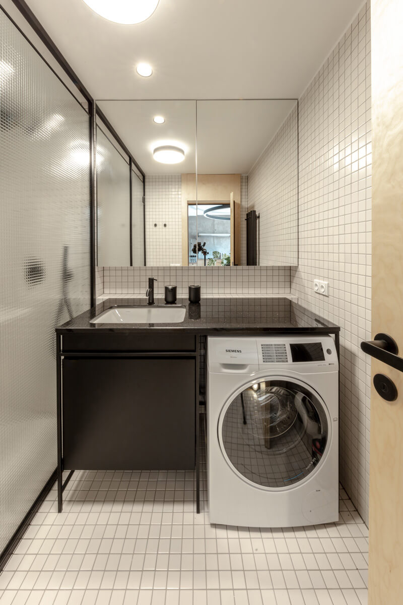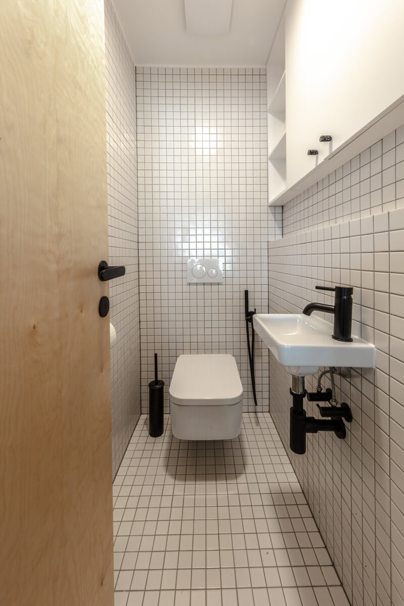 V podobnom, mierne industriálnom duchu, sa nesú aj zvyšné miestnosti bytu. Hygienické priestory v sebe kombinujú maloformátový obklad bielej farby, čierne detaily aj nábytok vyrobený na mieru či iné detaily z čierneho kovu.