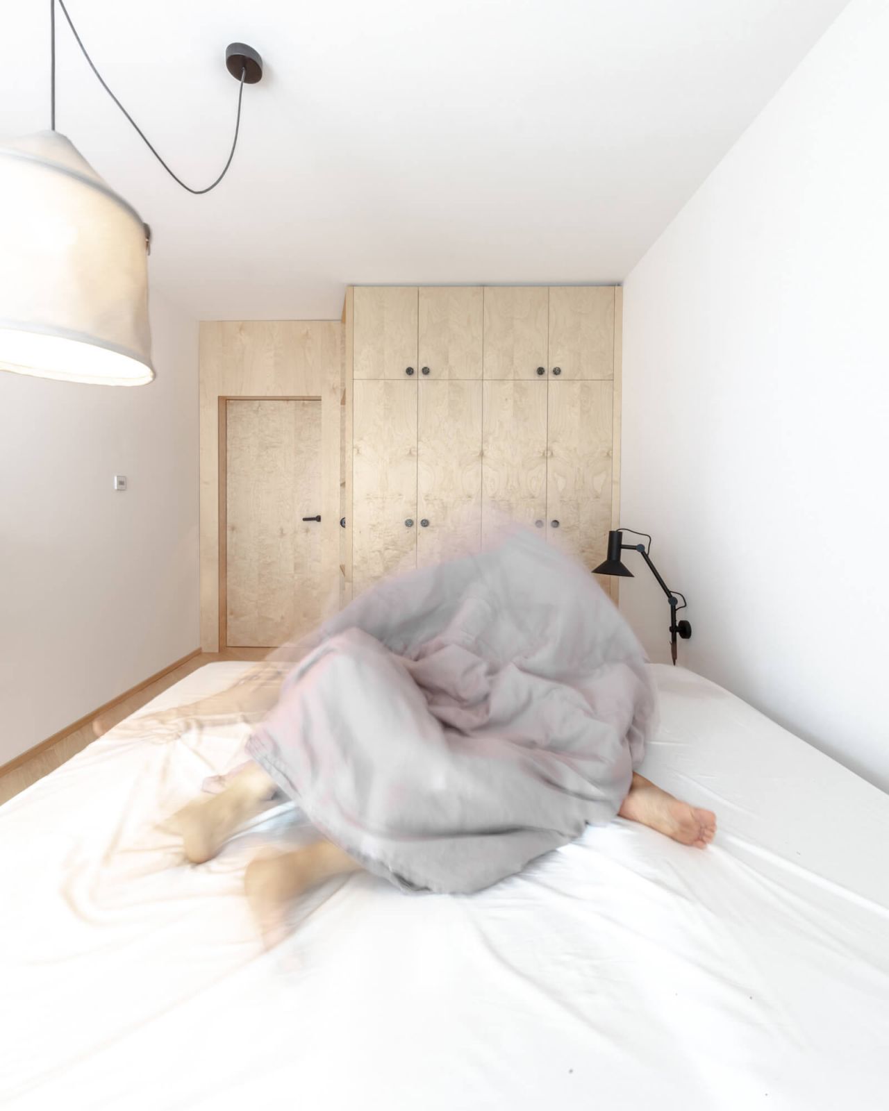 Spálni kraľuje priestranná posteľ bez čela, doplnená o jednoduché konferenčné stolíky a dvojicu nástenných lámp. Potrebný úložný priestor bol v miestnosti vyriešený sériou na mieru navrhnutých skríň z brezovej preglejky.