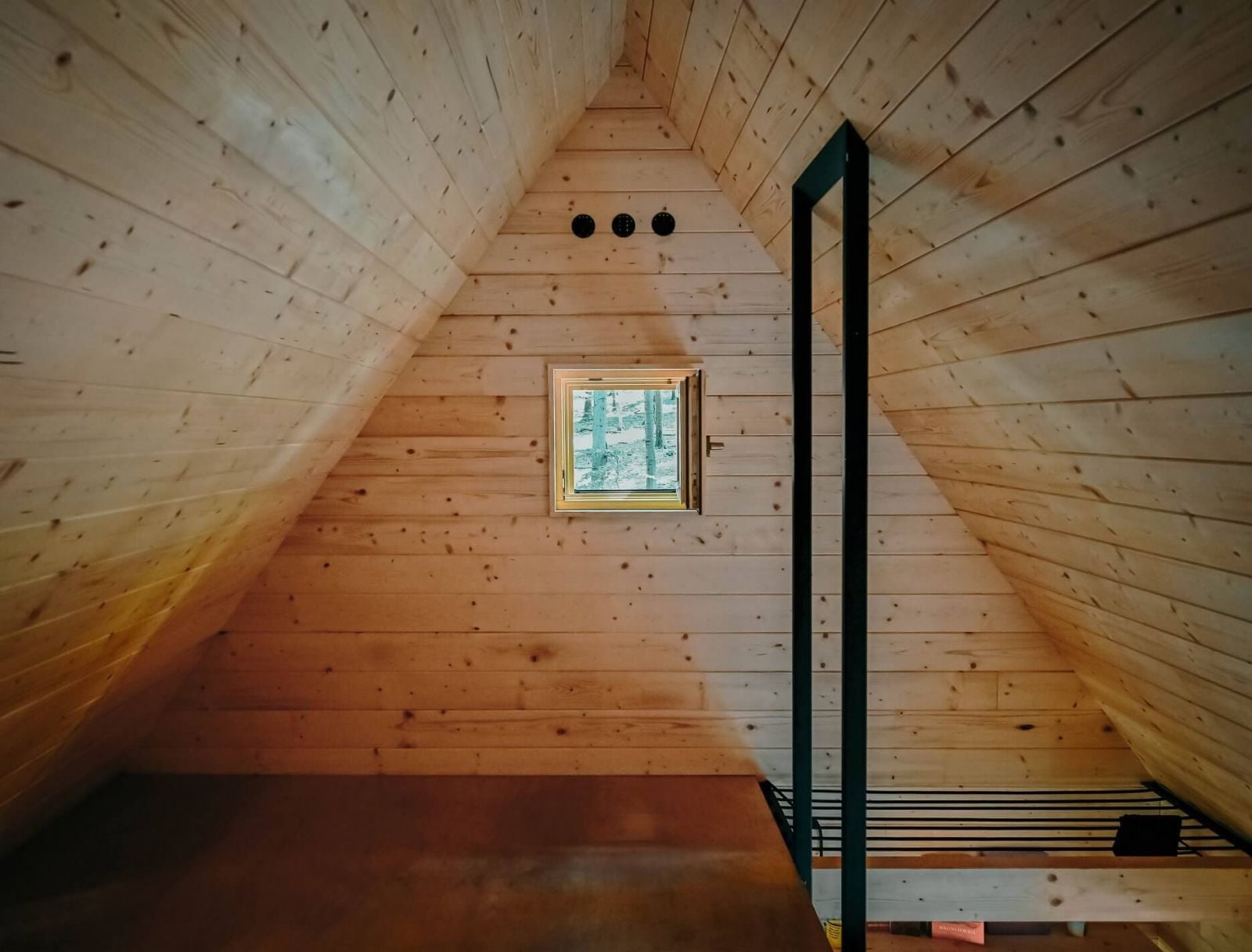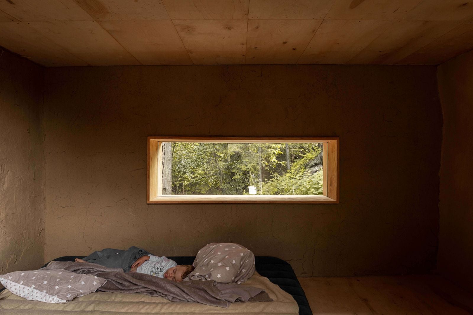 Architekti zvolili jednoduchý a funkčný koncept – kompaktný objekt s pultovou strechou, ktorý kombinuje praktické riešenia s výraznou vizuálnou formou. Interiér je rozdelený na priestor pre spanie na troch úrovniach, jedálenské sedenie, piecku a úložné časti, pričom nosná konštrukcia je priznaná a zároveň funkčná. Stavba je kompletne drevená, zhotovená z rámovej konštrukcie so smrekovou a borovicovou preglejkou, zateplená a zakrytá tmavou prevetrávanou fasádou.