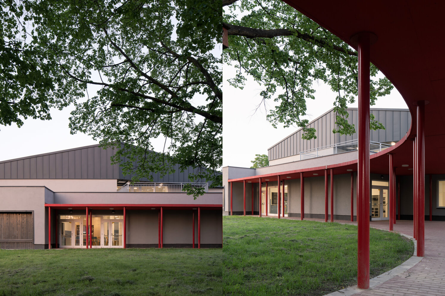 Samostatne fungujúce objekty boli následne prepojené výrazným, organicky tvarovaným prestrešením, ktoré podporuje výučbu v exteriéri. Zároveň tento prvok umožňuje aj usporadúvanie rôznych menších exteriérových podujatí, ako sú výstavy či trhy. Červená farba prestrešenia bola aplikovaná na želanie klienta s cieľom upozorniť na objekt a jeho význam v rámci obce.