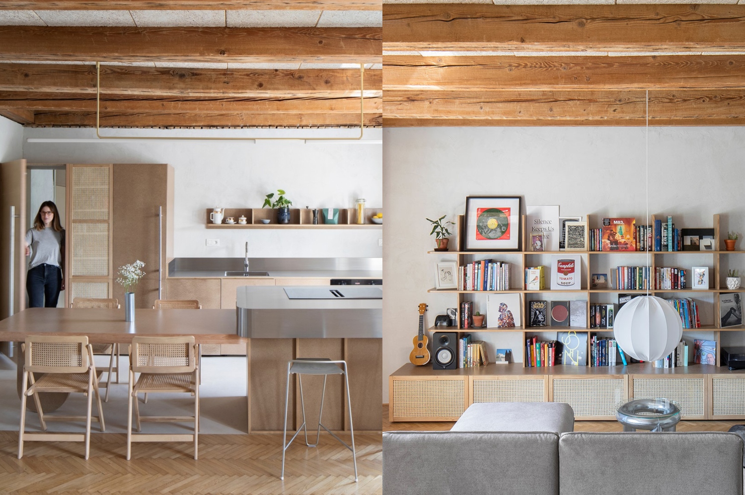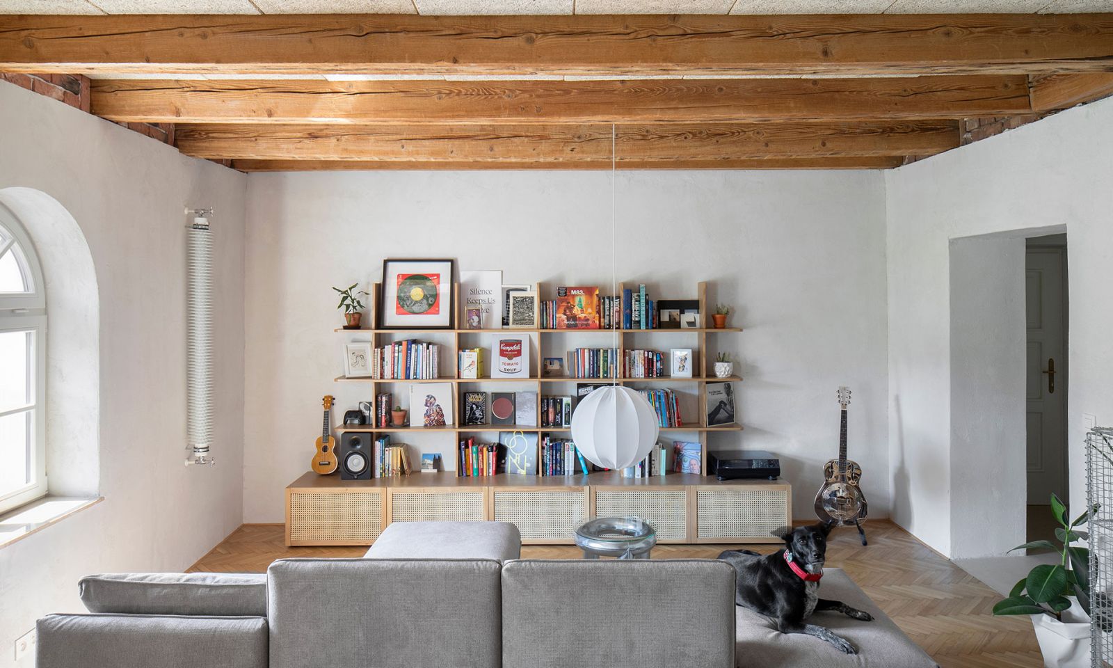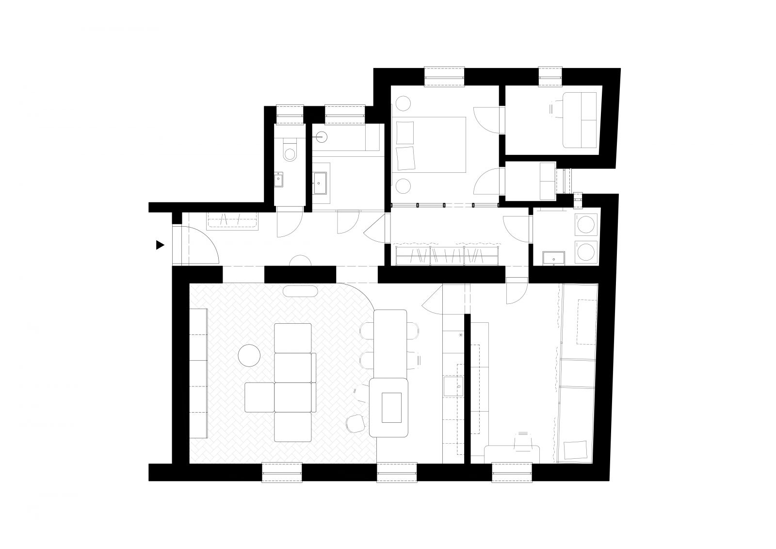 Netradičné danosti priestoru dopomohli k udaniu základnej povahy pôvodného bytu s tri a pol izbami. Zachovanie dispozície v maximálnej možnej miere a priznanie masívnych drevených trámov definovalo výraz bývania, do ktorého architekt následne vkladal zariadenie.