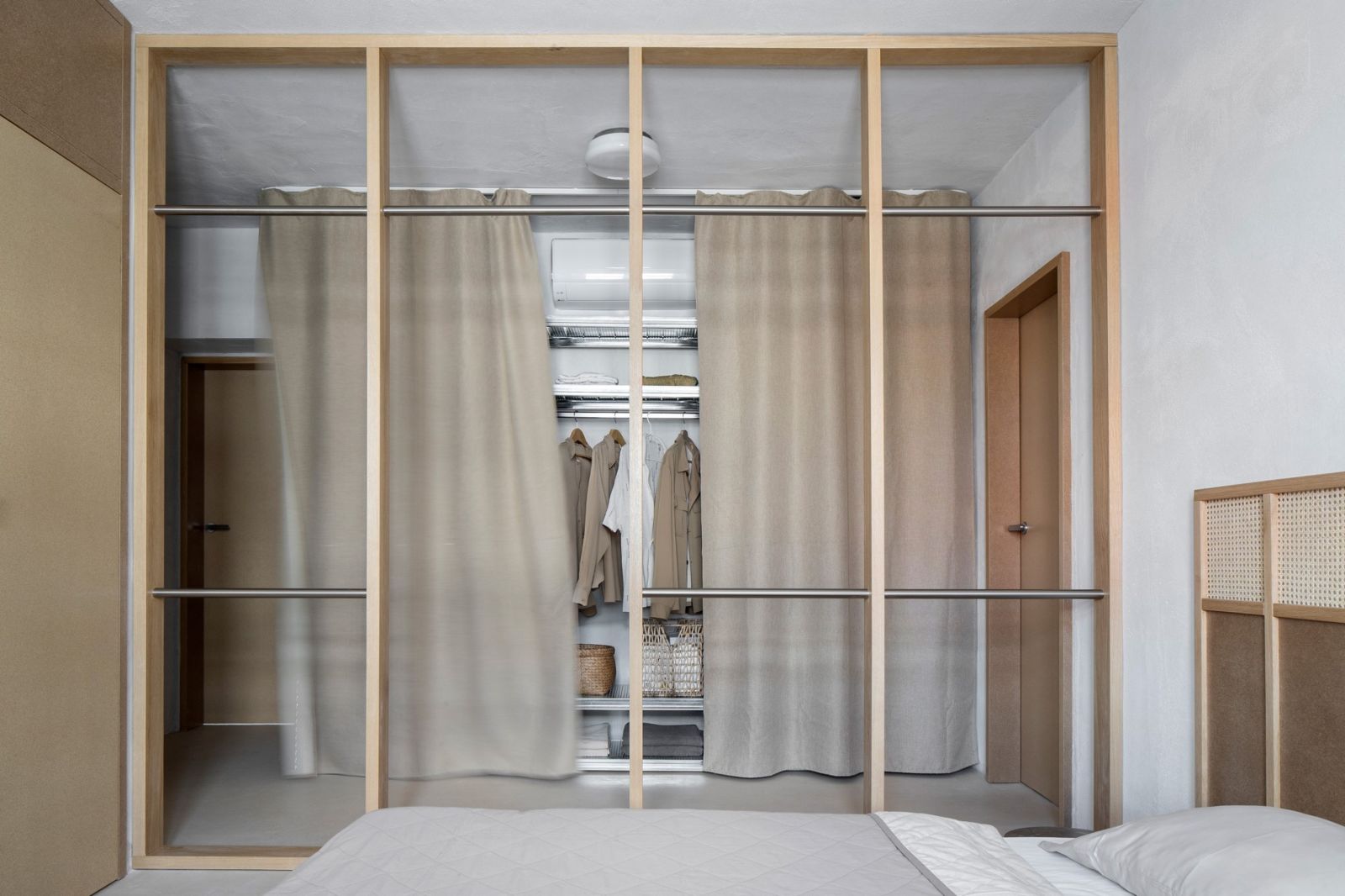 Napriek tomu, že maximalizácia úložného priestoru si vyžadovala nábytky na mieru, aj tu našiel architekt kompromis. Materiál surovej drevotriesky, ktorý sa zvyčajne používa ako podklad, predstavuje v byte základ atypického zariadenia, ale aj dverí. Za zmienku stoja aj štandardné regálové systémy, využité ako šatníkové úložisko. Pravosť interiéru podporujú prírodné materiálové riešenie, kedy drevodekor spolu s ratanom dodávajú priestoru dojem útulného minimalizmu a zároveň tlmia biely základ miestností.