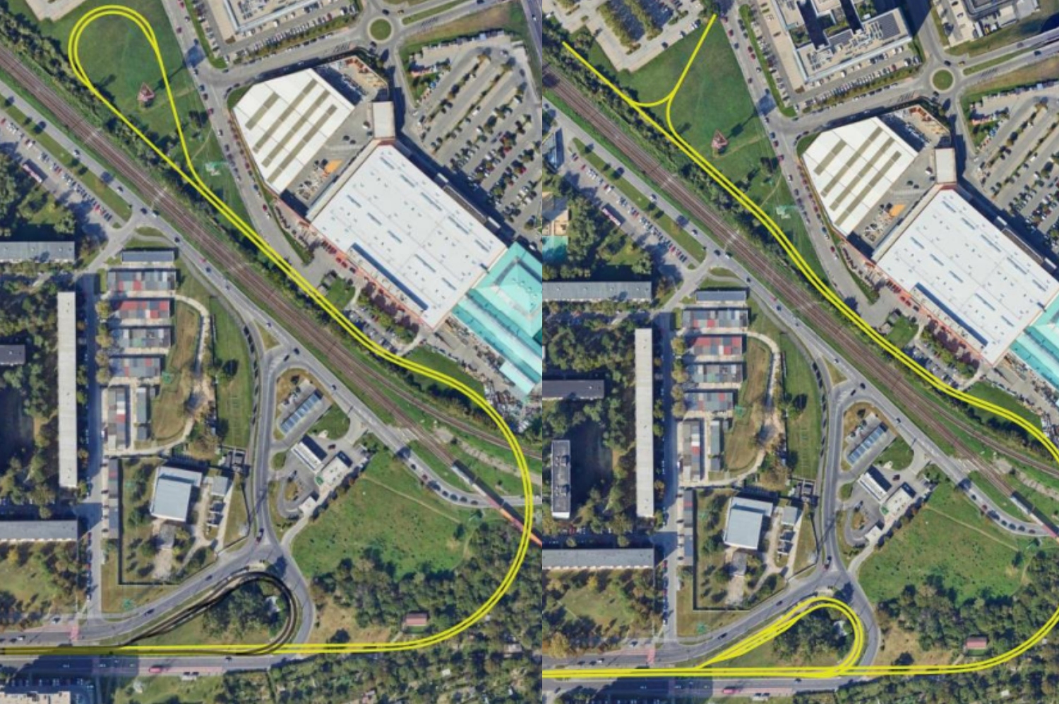 Varianty vedenia trate smerom k TIOPu - vľavo Var. 1, vpravo Var. 2. Zdroj: Bratislava - Hlavné mesto SR / EIA