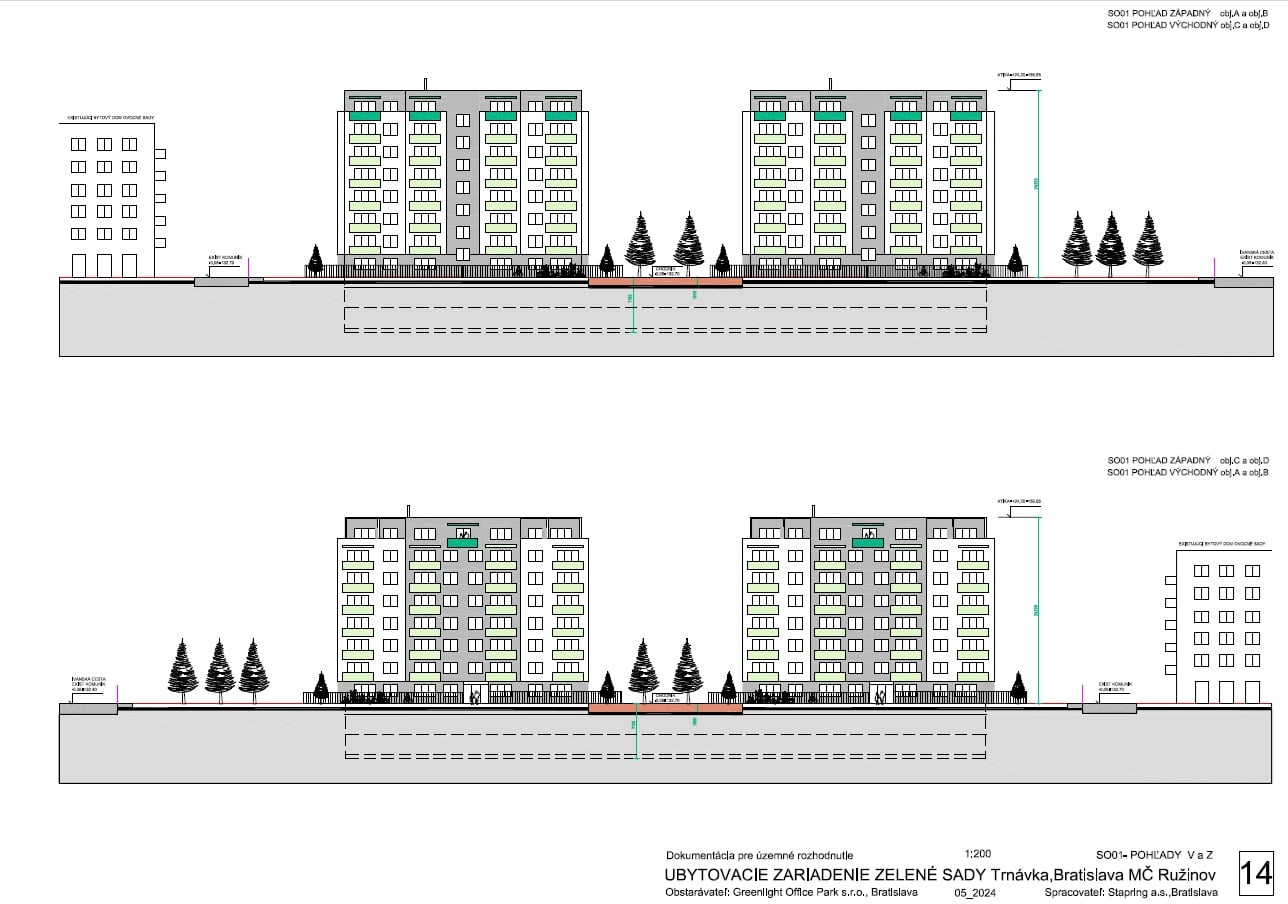 Zámer zahŕňa výstavbu štyroch identických budov (A, B, C, D) s ôsmimi nadzemnými podlažiami. Každá budova bude mať centrálny vstup so schodiskom a výťahom, spájajúcim 244 ubytovacích jednotiek. Podľa dokumentácie nepôjde o byty, ale o ubytovacie zariadenie s občianskou vybavenosťou.