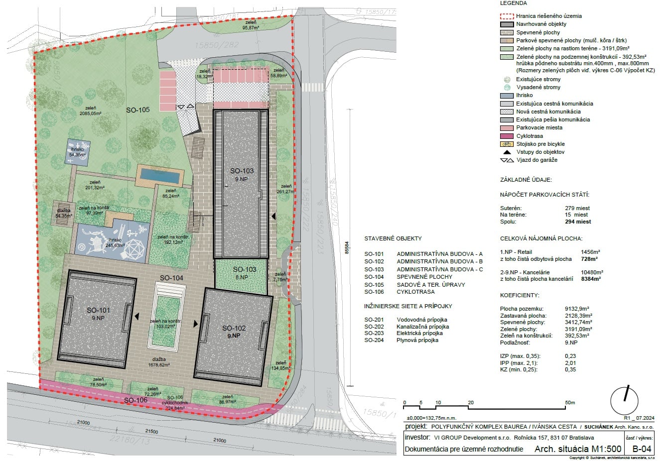 Objekty B a C budú navzájom prepojené a vytvoria jednotný celok. Všetky tri stavby spojí spoločná podzemná garáž, v ktorej bude umiestnená väčšina z plánovaných 294 parkovacích miest. Na teréne bude len 15 stojísk. Každý objekt bude mať deväť nadzemných podlaží, najvyššie bude ustúpené.