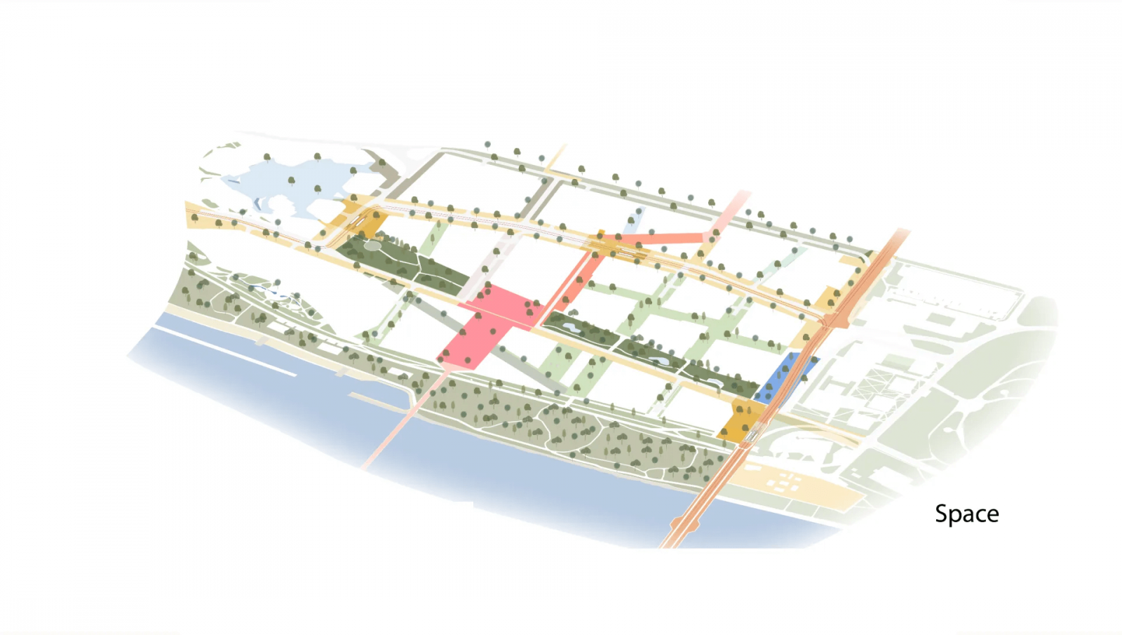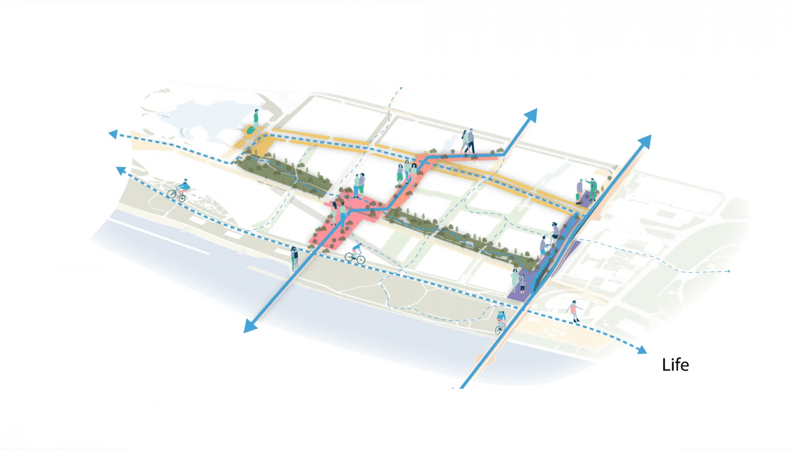 Gehl Architects pripomína, že v území bude prítomná silná hierarchia verejných priestorov, od ulíc, cez námestia až po parky. S ohľadom na typ priestranstiev budú umiestňované aj typy prevádzok v parteri, pričom budú mať jasnú retailovú stratégiu. V prípade vyššie zmieneného business plaza tak možno napríklad očakávať prítomnosť kaviarní a reštaurácií, do ktorých budú chodiť zamestnanci z okolitých administratívnych objektov na obedy či stretnutia.