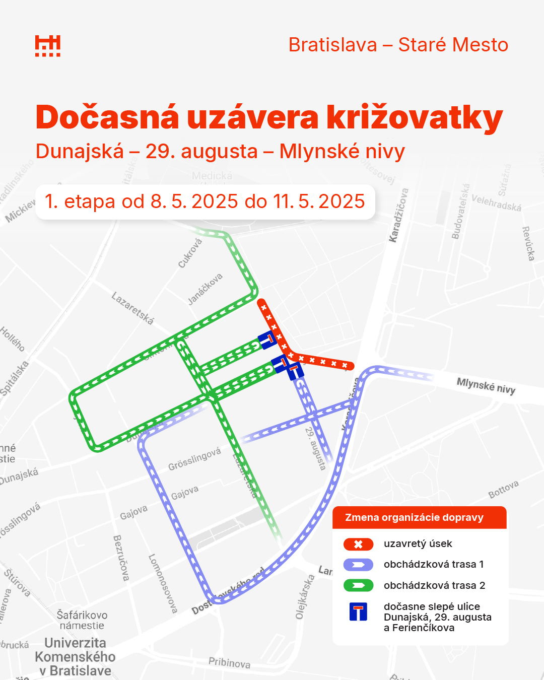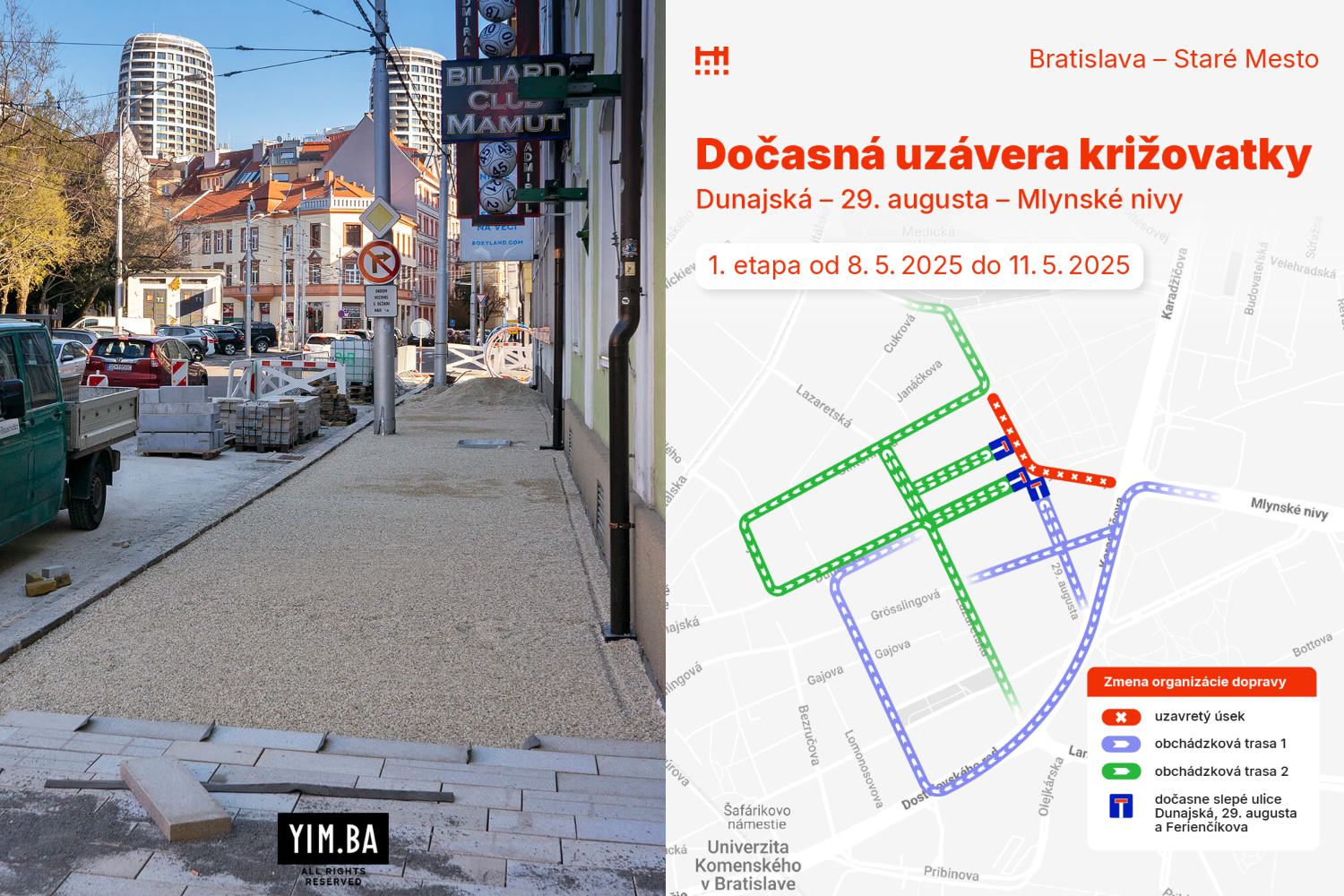 Ako oznámilo mesto na sociálnej sieti, od pondelka (12.5.) tu nastanú ďalšie dopravné zmeny. Dunajská ulica bude zjednosmernená od križovatky s Rajskou v smere na Mlynské nivy. Z Mlynských nív tak nebude možné pokračovať priamo na Dunajskú, pre vozidlá prichádzajúce z tohto smeru bude táto ulica prístupná obchádzkou cez Cintorínsku. Jazda po Dunajskej ulici bude možná po ľavej strane vozovky, vozovku na jej pravej strane čaká oprava.
