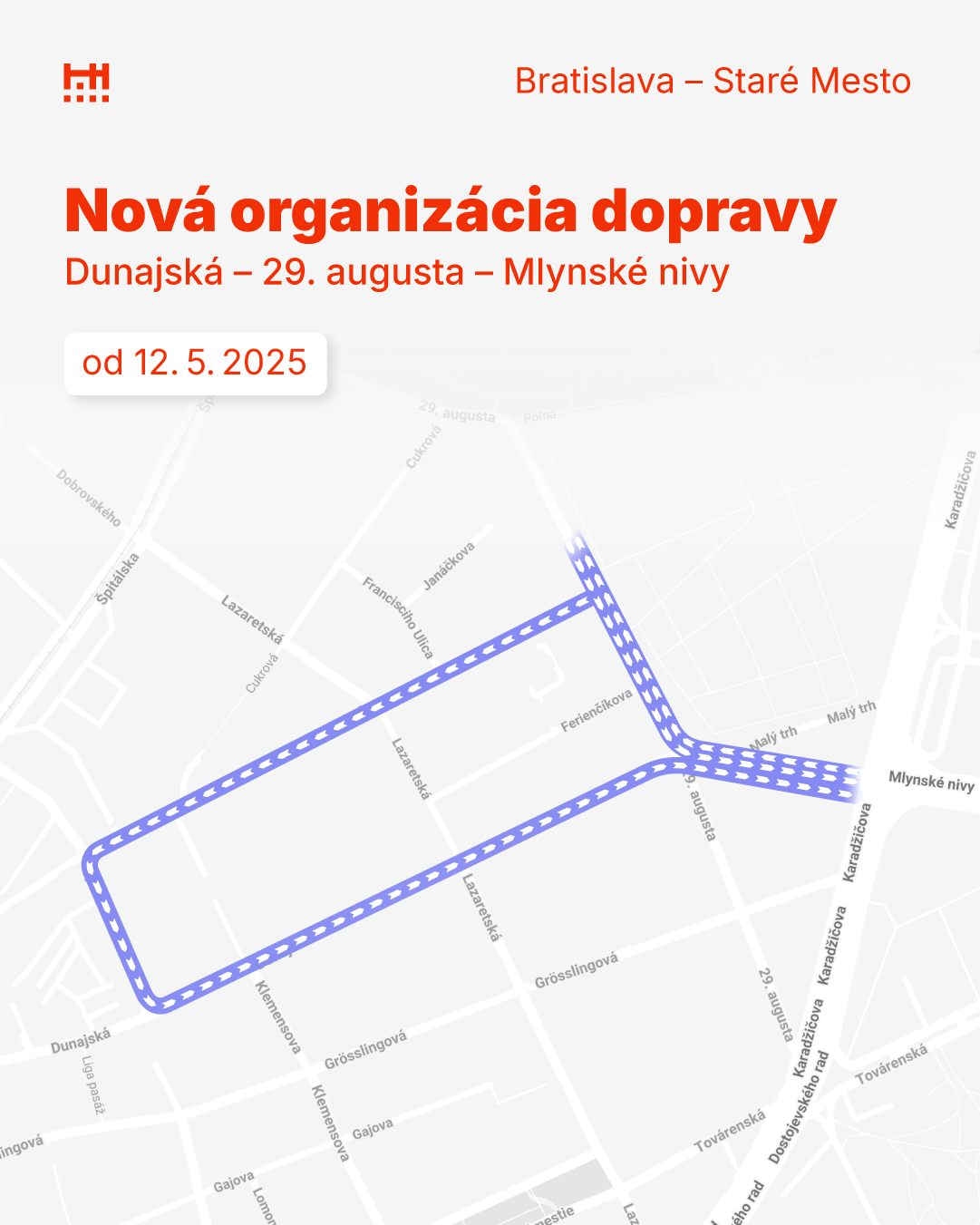 Na Ulici 29. augusta pribudne nový ľavý odbočovací pruh na Cintorínsku ulicu, aby odbočujúce autá neblokovali vozidlá v priamej jazde na Špitálsku ulicu. Vodorovné značenie na tomto úseku má byť vyznačené až v pondelok večer. Na „malých“ Mlynských nivách v smere z Karadžičovej ulice na Ulicu 29. augusta bude iba jeden jazdný pruh. Z neho bude možné odbočiť už len doprava na Ulicu 29. augusta do jedného súčasného pruhu, Dunajská ulica bude totiž v opačnom smere zjednosmernená.