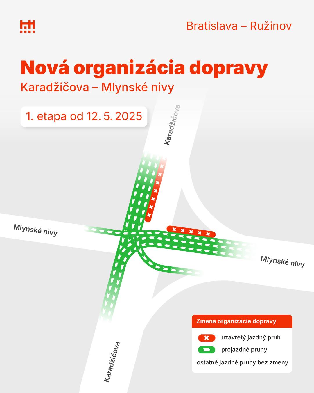 Na jeden pruh na „malých“ Mlynských nivách sa bude napájať len jeden priamy pruh z „veľkých“ Mlynských nív, a to v smere od autobusovej stanice. Zároveň si práce vyžiadajú dočasné zabratie jedného z dvoch ľavých odbočovacích pruhov z Karadžičovej ulice na Mlynské nivy, v smere z Legionárskej ulice.