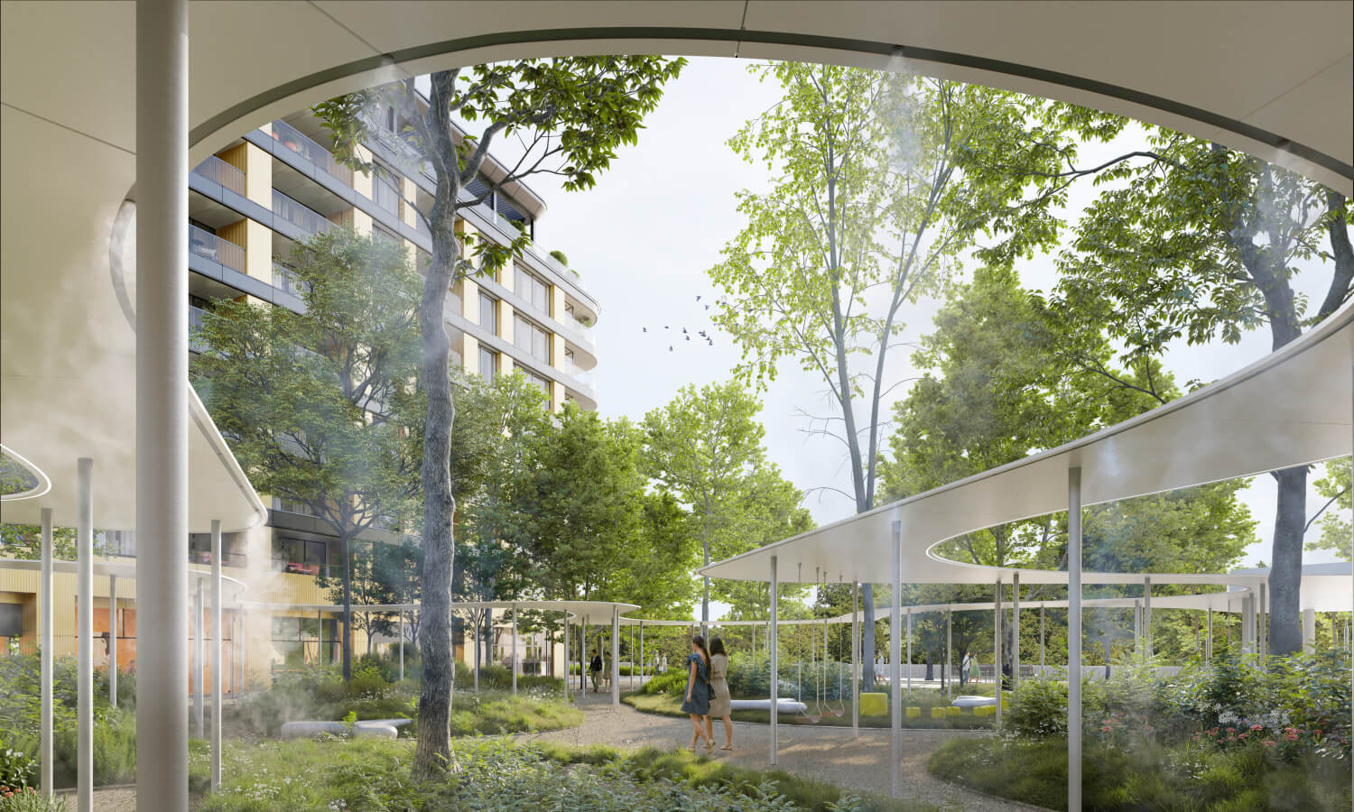 Priestranstvá medzi krídlami (dvory) dostanú atraktívnu sadovú úpravu, v dvoch prípadoch vzniknú parky s vodnými plochami, v jednom prípade akési mikronámestie. Očakáva sa aj umiestnenie umeleckého diela. Dvory budú verejne prístupné a bude tu aj parkovanie pre bicykle v počte 45 stojísk. Stromy na Dvořákovom nábreží, predovšetkým južná rada topoľovej aleje, bude zachovaná a dosadená novými stromami. Okrem toho vznikne aj nová platanová alej. Dlažba by mala byť zo žuly, v zmysle požiadaviek mesta.